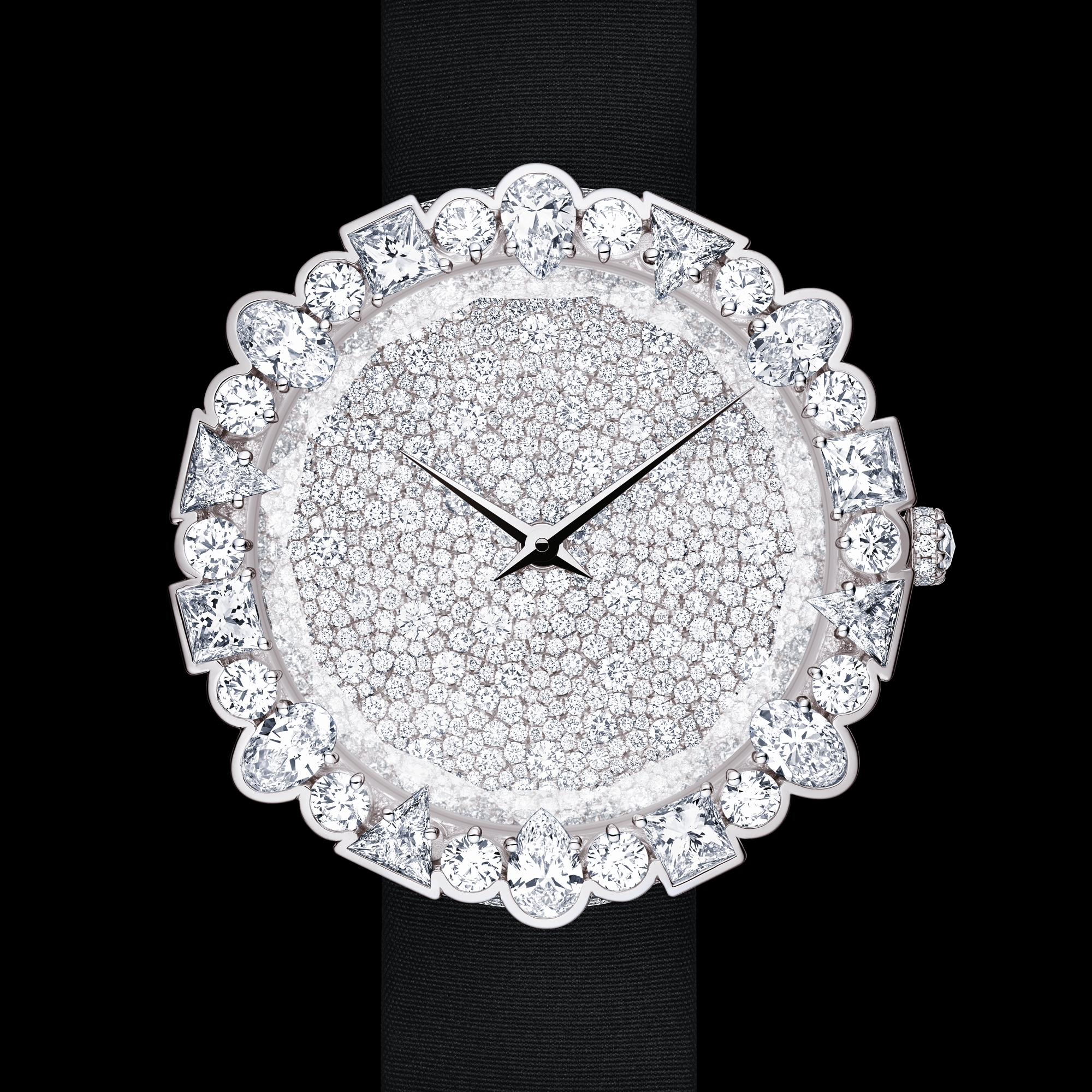 White gold case paved with diamonds, bezel set with pear, oval, princess and triangle-cut diamonds, case middle paved with snow-set diamonds, crown paved and set with a rose-cut diamond, faceted sapphire crystal glass.