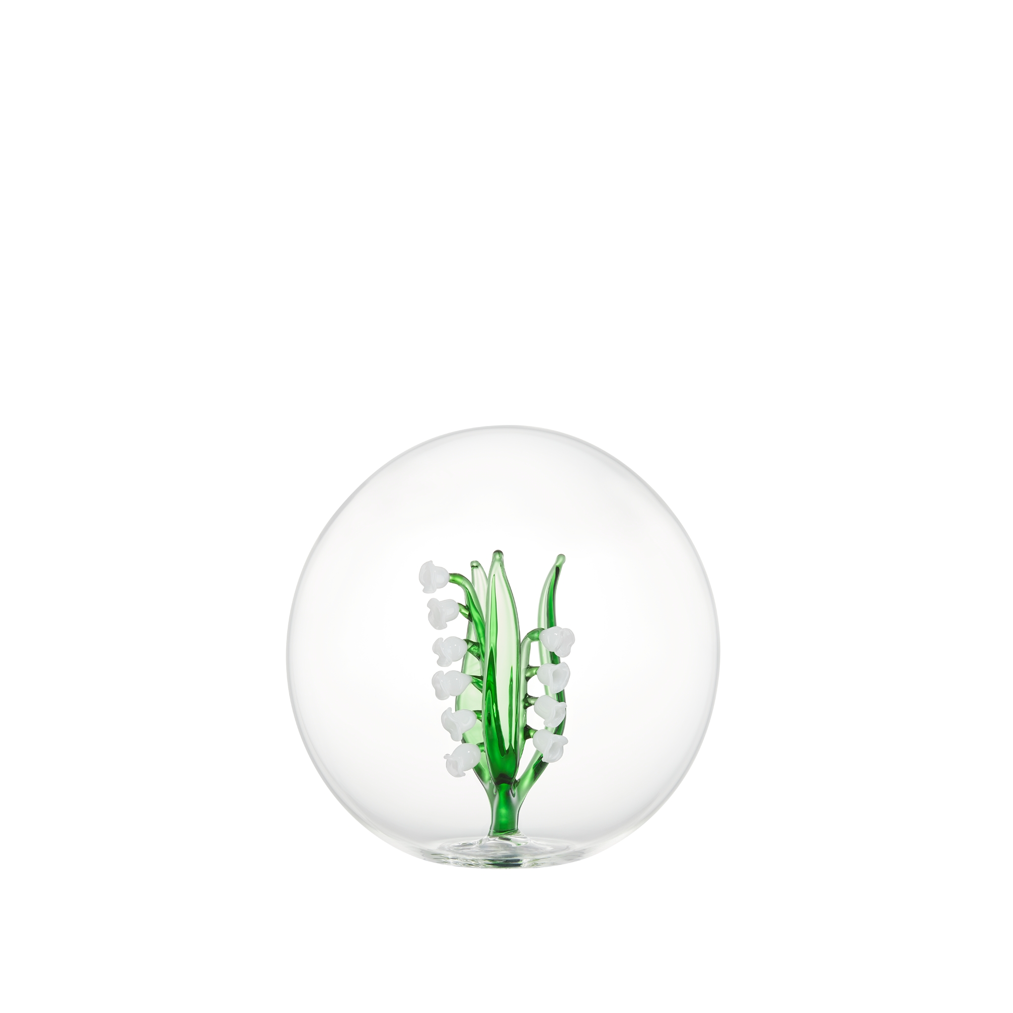 Hand-blown decorative glass ball enclosing a lily of the valley flower, the hallmark symbol of the Lily of the Valley line and flower often worn by Mr. Dior as a lucky charm at his fashion shows.