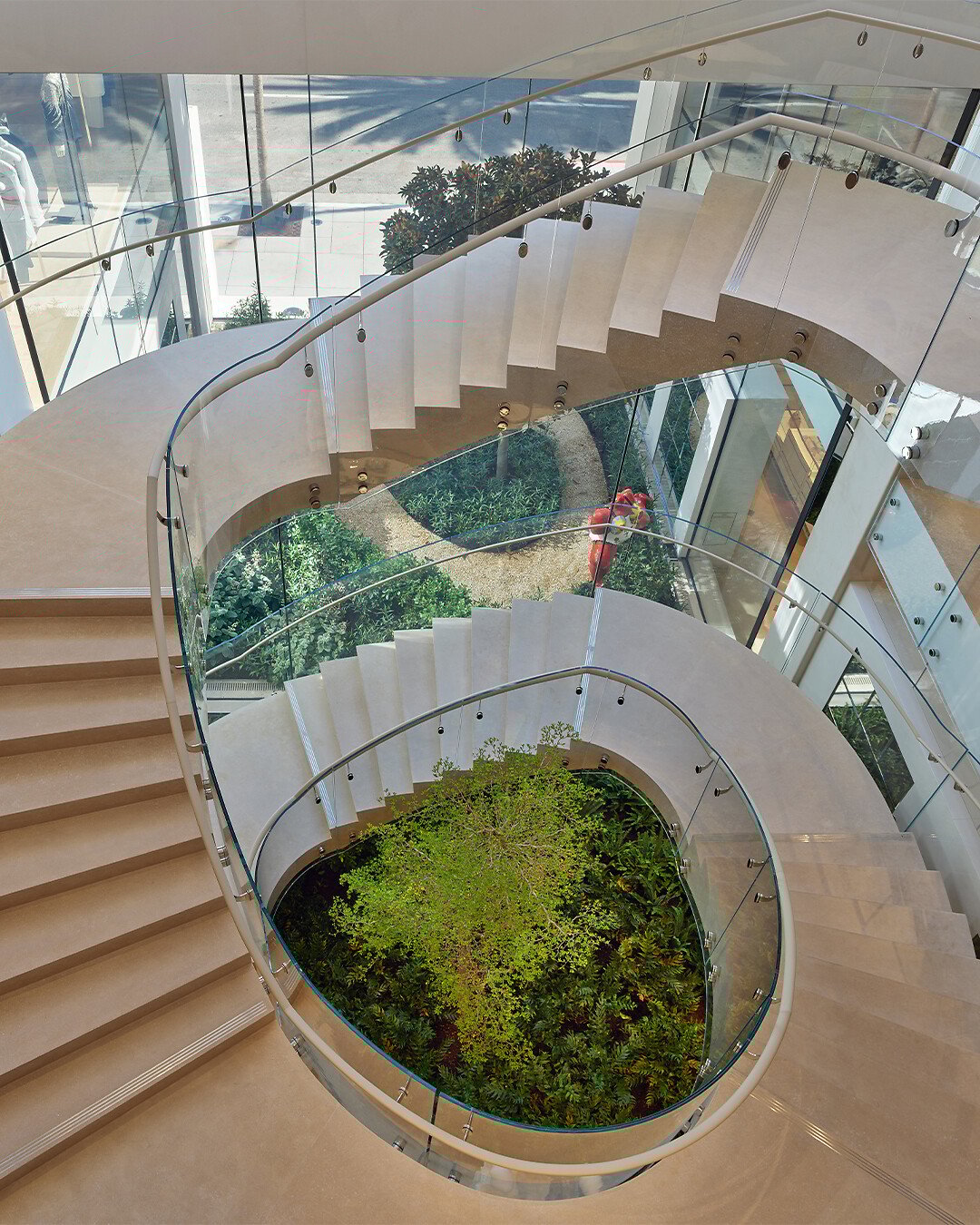 Designed by Peter Marino, this “realm of dreams” in the form of an entirely new building for the House of Dior presents a striking dialogue between architecture, nature, and fashion, spread over four floors. Behind the undulating limestone façade, a pared-down and refined atmosphere is unveiled, while a monumental central staircase winds through a lush, three-story garden conceived by Peter Marino and brought to life by landscape architect Peter Wirtz.