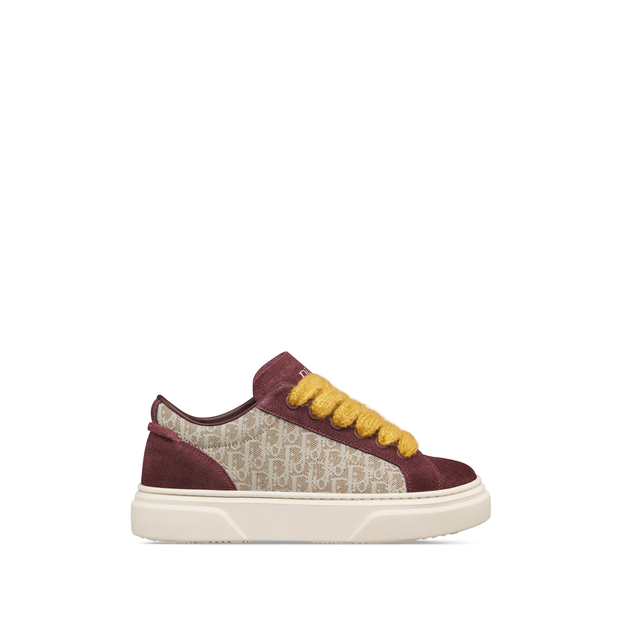 This season, the essential B33 Spin sneaker is offered in a dynamic color palette. Crafted in beige Dior Oblique jacquard with burgundy suede panels, it features a padded tongue displaying the Dior signature and wide, yellow mohair laces with tonal brass eyelets. Completed by an ivory rubber sole, the sneaker can be worn by both girls and boys to create a relaxed look.