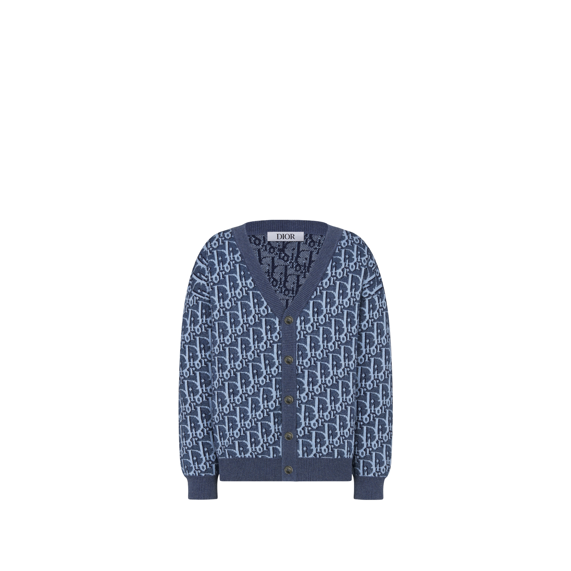 Inspired by Dior Men, the cardigan sports the House's iconic Dior Oblique motif. Crafted in a blue cotton knit, it has a timeless silhouette. Accented by ribbed detailing and a placket with brown buttons, the cardigan will pair effortlessly with pants from the collection for a signature look.