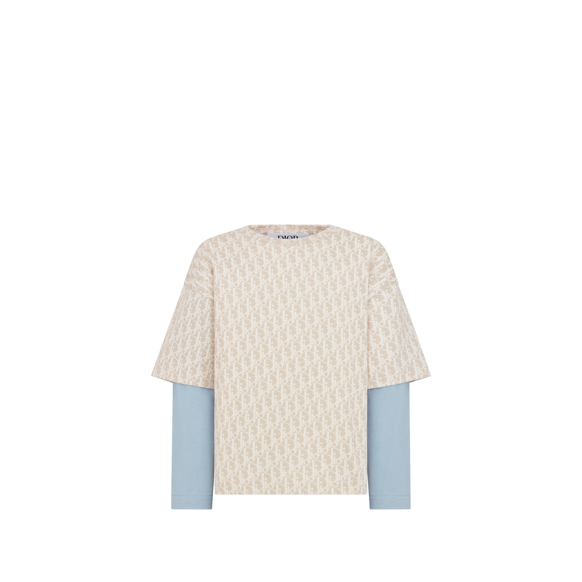 The long-sleeved T-shirt stands out with a trompe-l'oeil silhouette and dropped shoulders. Crafted in cotton jersey printed with the emblematic beige Dior Oblique motif, it features solid-colored light blue sleeves. Completed by a crew neck, the T-shirt can be worn with pants from the collection for a dynamic look.