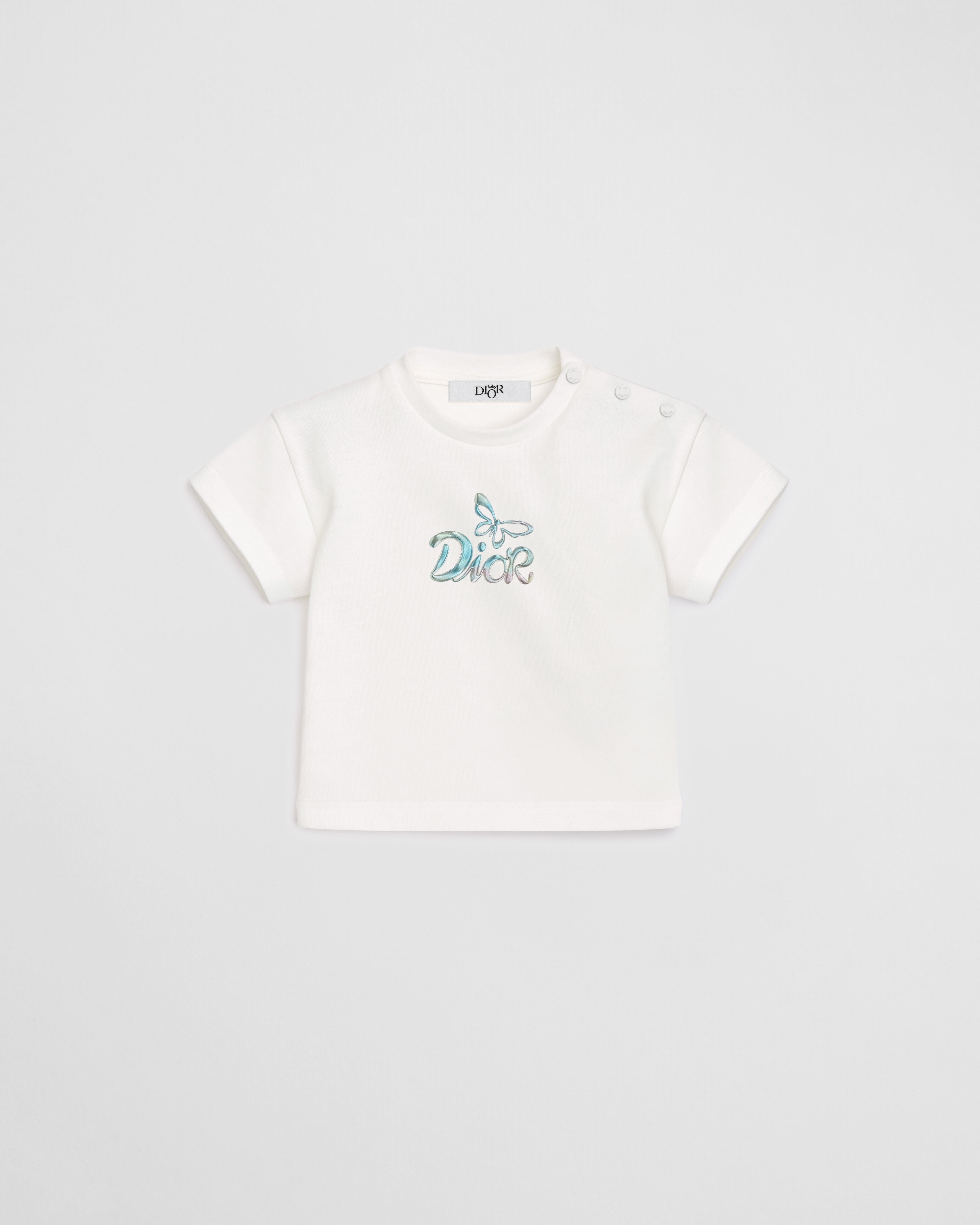 New for Summer 2026, the T-shirt combines simplicity and delicacy. Crafted in ivory cotton jersey, it is embellished with an iridescent gradient butterfly Dior signature with a 3D effect on the front. Completed by shoulder snaps for easy dressing, the T-shirt will pair effortlessly with the light blue denim pants from the collection for a fresh look.