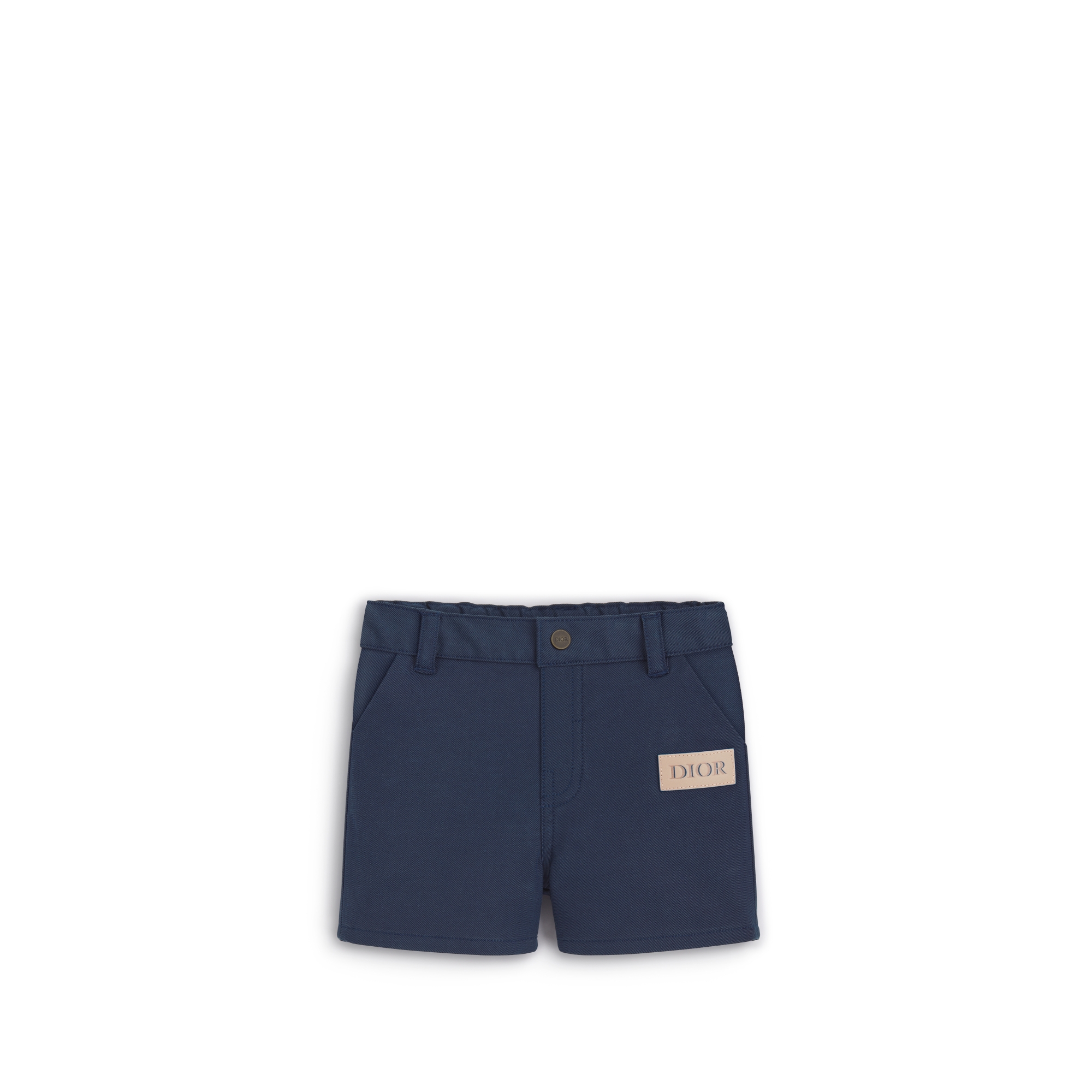 The shorts showcase a streamlined regular-fit silhouette. Crafted in a navy blue cotton blend, they are enhanced by slanted pockets, as well as elastic on the back of the waist for easy dressing. Adorned with a beige and blue leather Dior patch, the shorts will pair effortlessly with styles from the collection for a laid-back look.