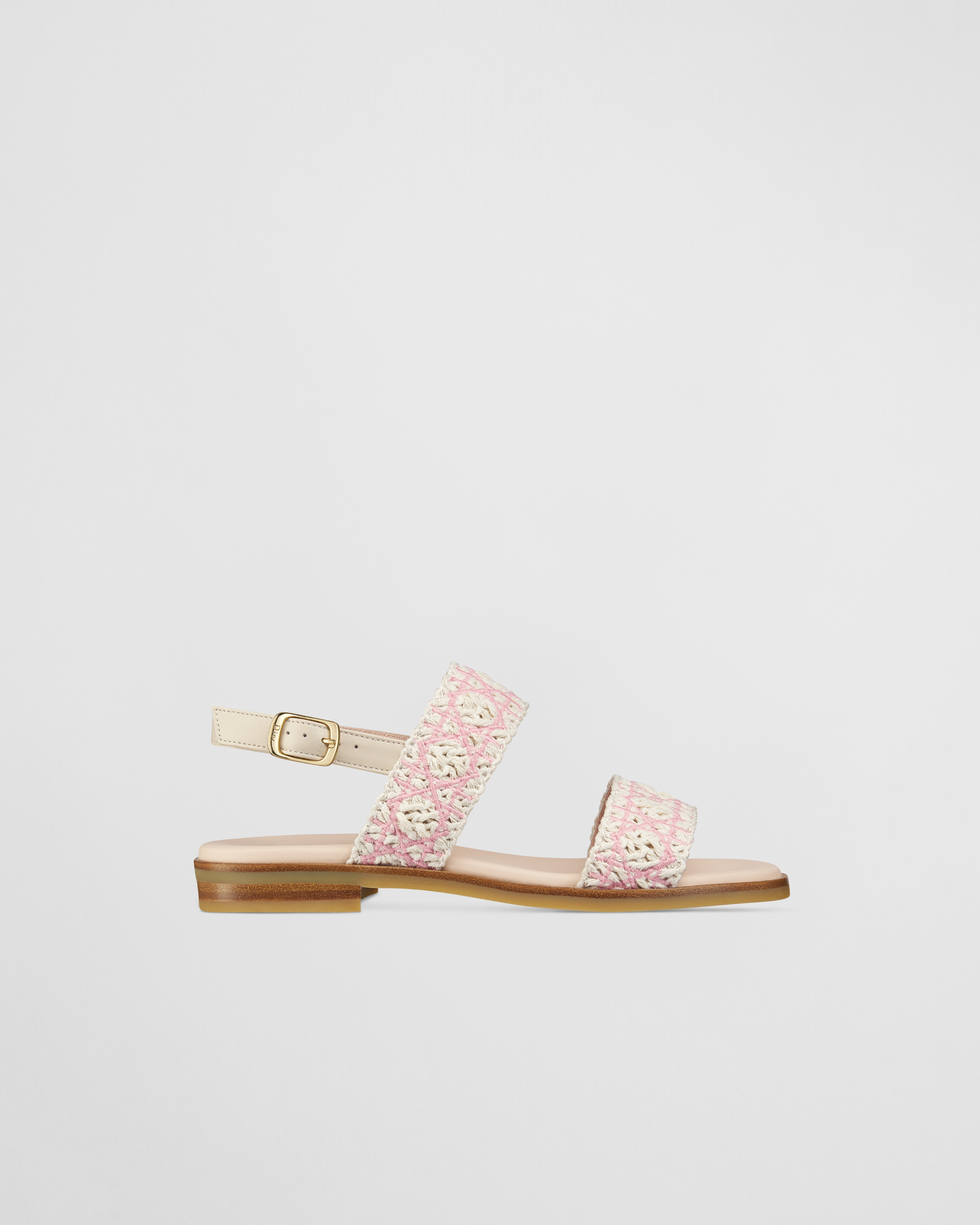 The sandal showcases House heritage with the iconic Cannage motif. Crafted in ivory raffia-effect cotton canvas, it is embroidered with pale pink thread for a delicate touch. Completed by a leather back strap with a metal buckle, the sandal will effortlessly coordinate with outfits from the collection for a joyful style.
