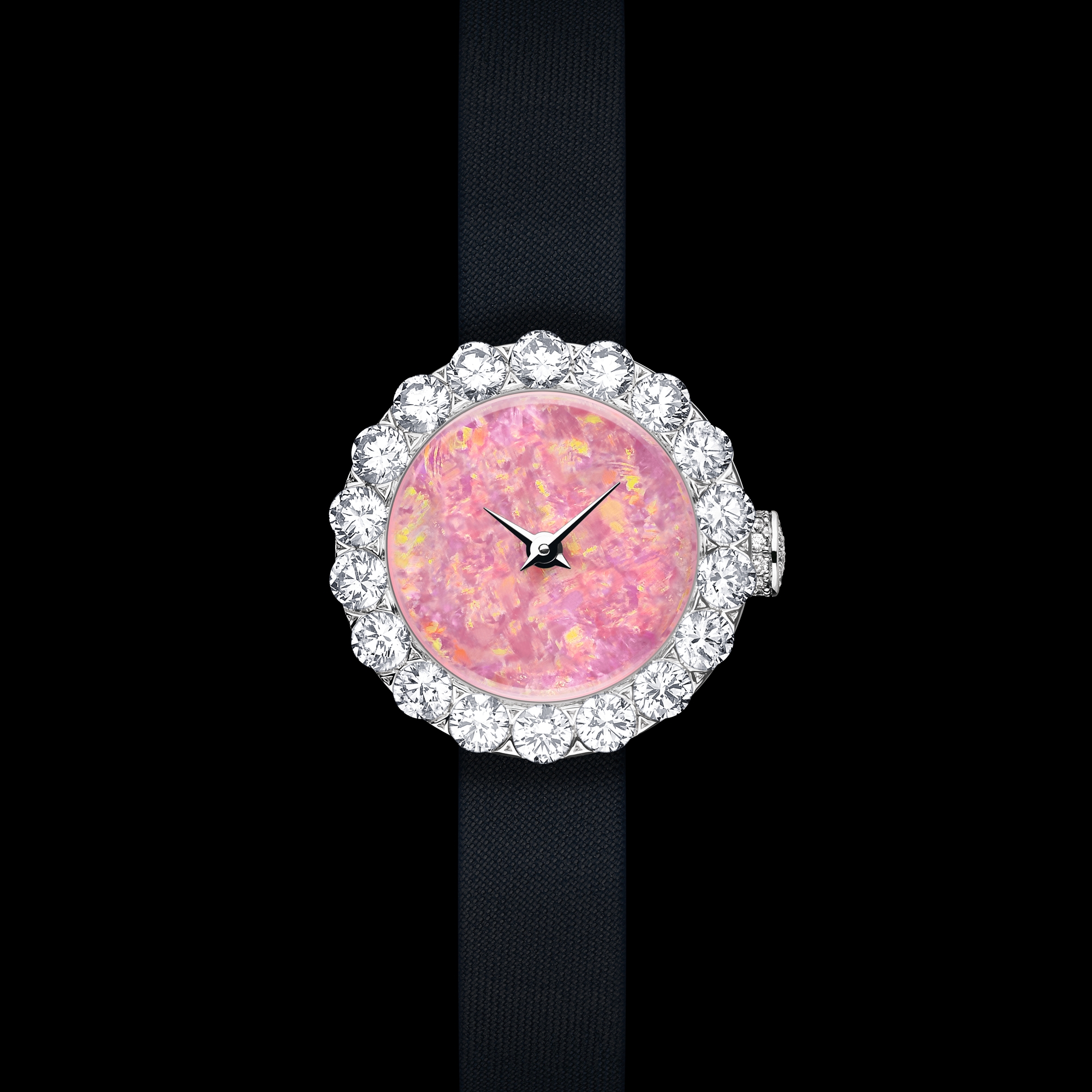 White Australian opal dial, pink fiery reflections, polished Dauphine hands in white gold.