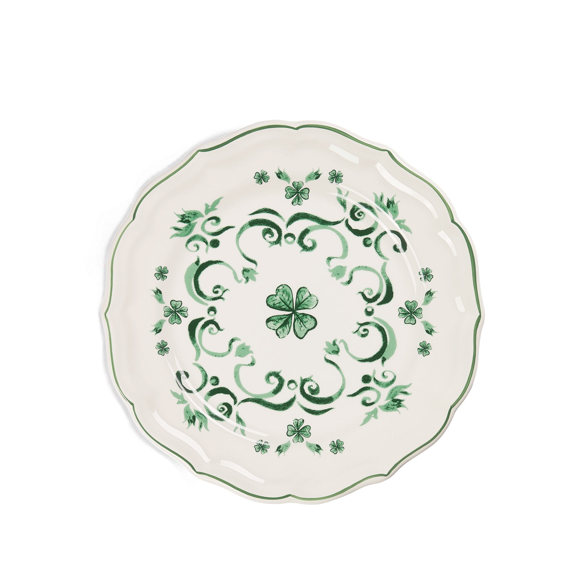 The dessert plate is unveiled as part of Cordelia de Castellane's Les Gris-Gris de Monsieur Dior collection and is embellished with the clover, Christian Dior's treasured symbol and lucky charm. Crafted in ecru ceramic elevated by delicate colors, it celebrates the art of living and the founding couturier's passion for superstition. The design will enhance tables with the House's iconic codes and can be coordinated with other creations from the collection for a poetic and joyous atmosphere.