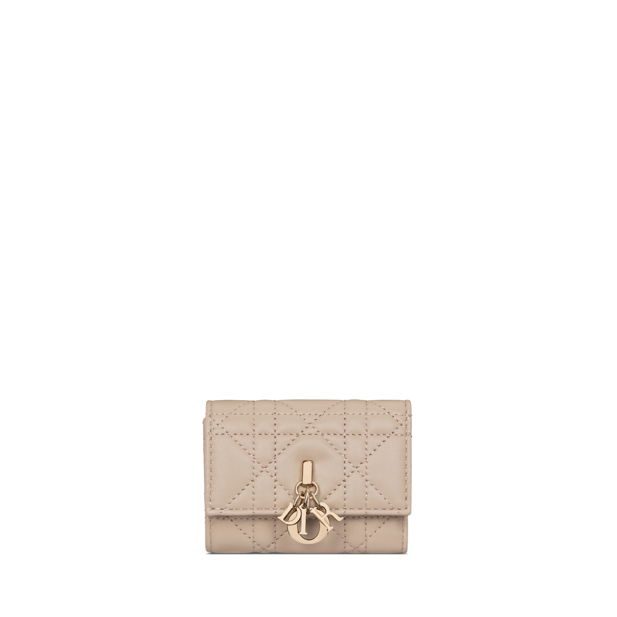The Veronia wallet expands the My Dior line with a compact and practical design. Crafted in desert taupe Cannage lambskin, it is enhanced by pale gold-finish metal D.I.O.R. charms on the front. Accommodating all the essentials, the refined accessory will fit anywhere and can be paired with other My Dior creations.