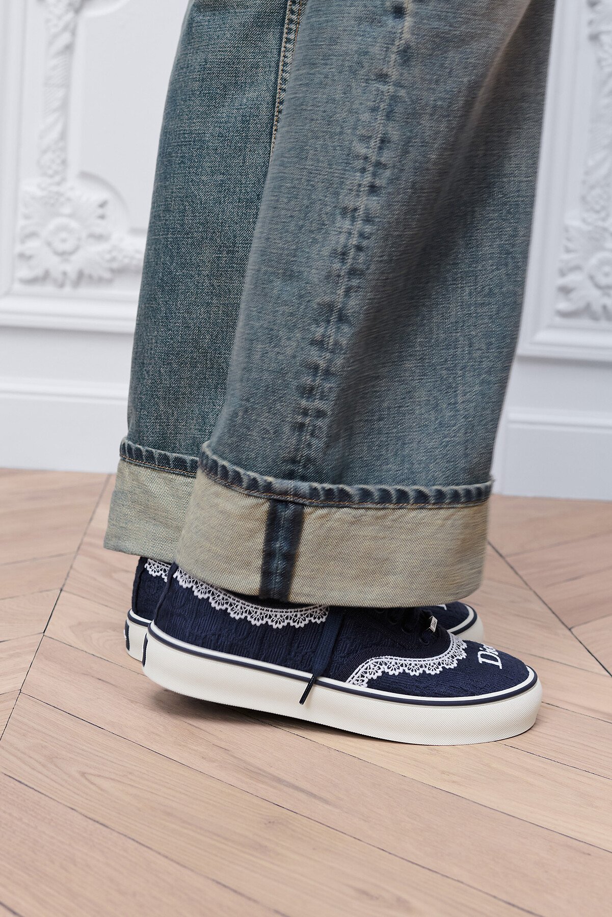 • Sneaker Dior Saltwind Algodón bordado Dior Oblique azul y encaje color crudo E02