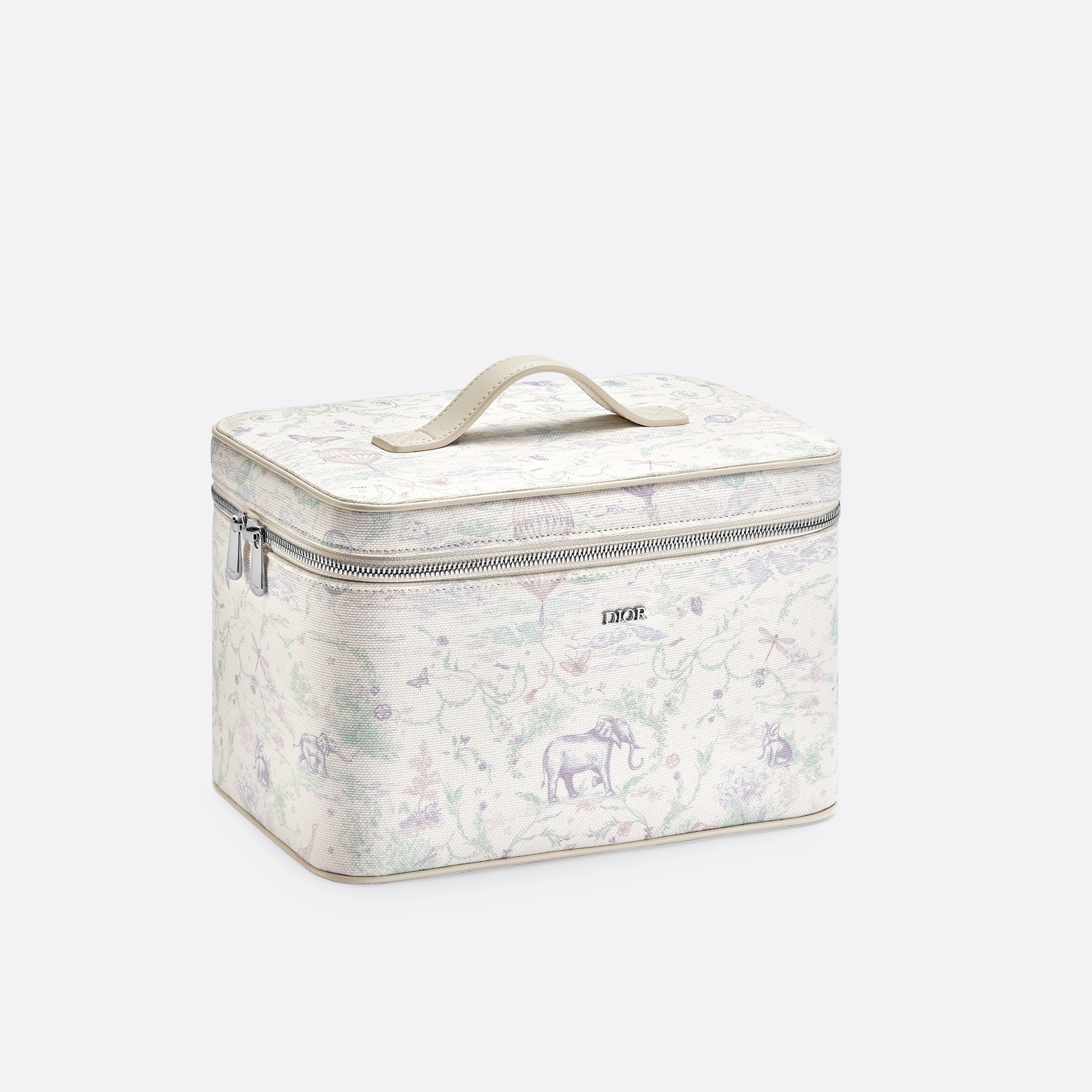 El motivo Toile de Jouy se reinterpreta en una versión pastel en este neceser, novedad de la temporada Primavera-Verano 2024. Se ha confeccionado en piel de becerro marfil con un estampado integral y consta de un compartimento único con una pequeña ranura y trabillas elásticas en el interior. La pieza se completa con un cierre de cremallera y un asa superior de piel marfil, y se ha adornado con una firma Dior metálica en la parte delantera. El neceser es ideal para guardar los artículos de aseo y los frascos de agua perfumada de la colección, así como todos los esenciales de pequeño tamaño de bebé.