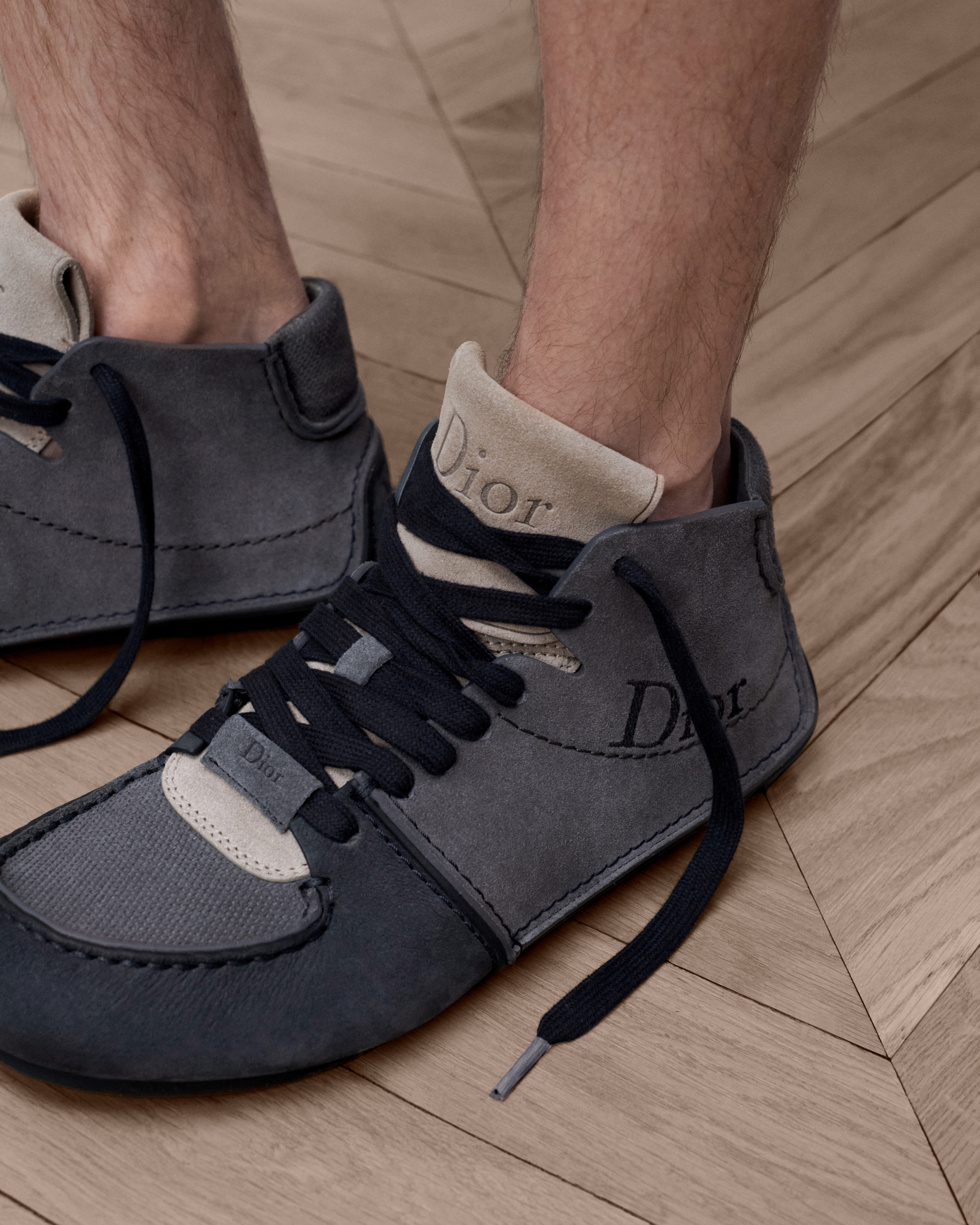•  Nobuk gris con ante de piel de becerro gris, azul marino y amarillo