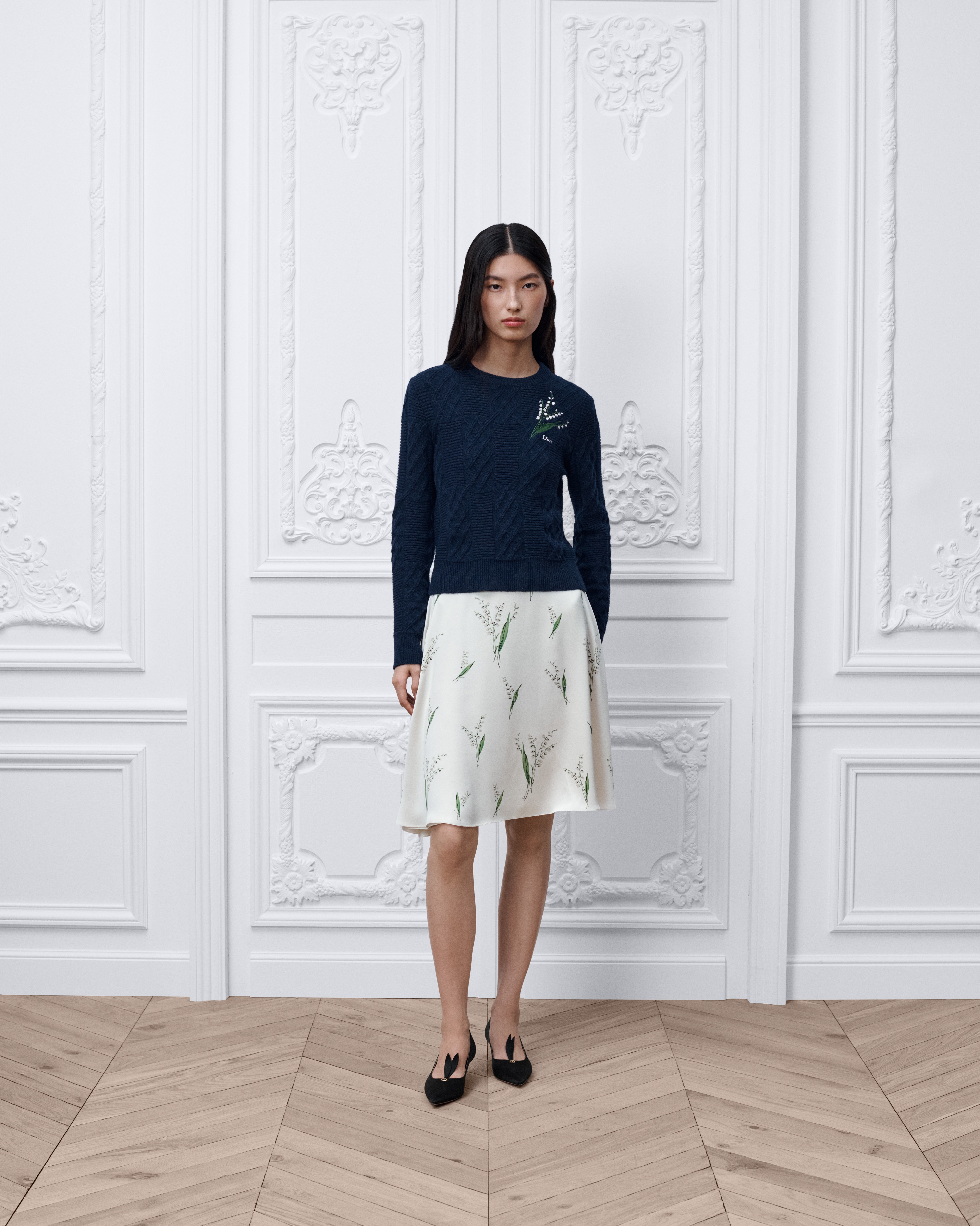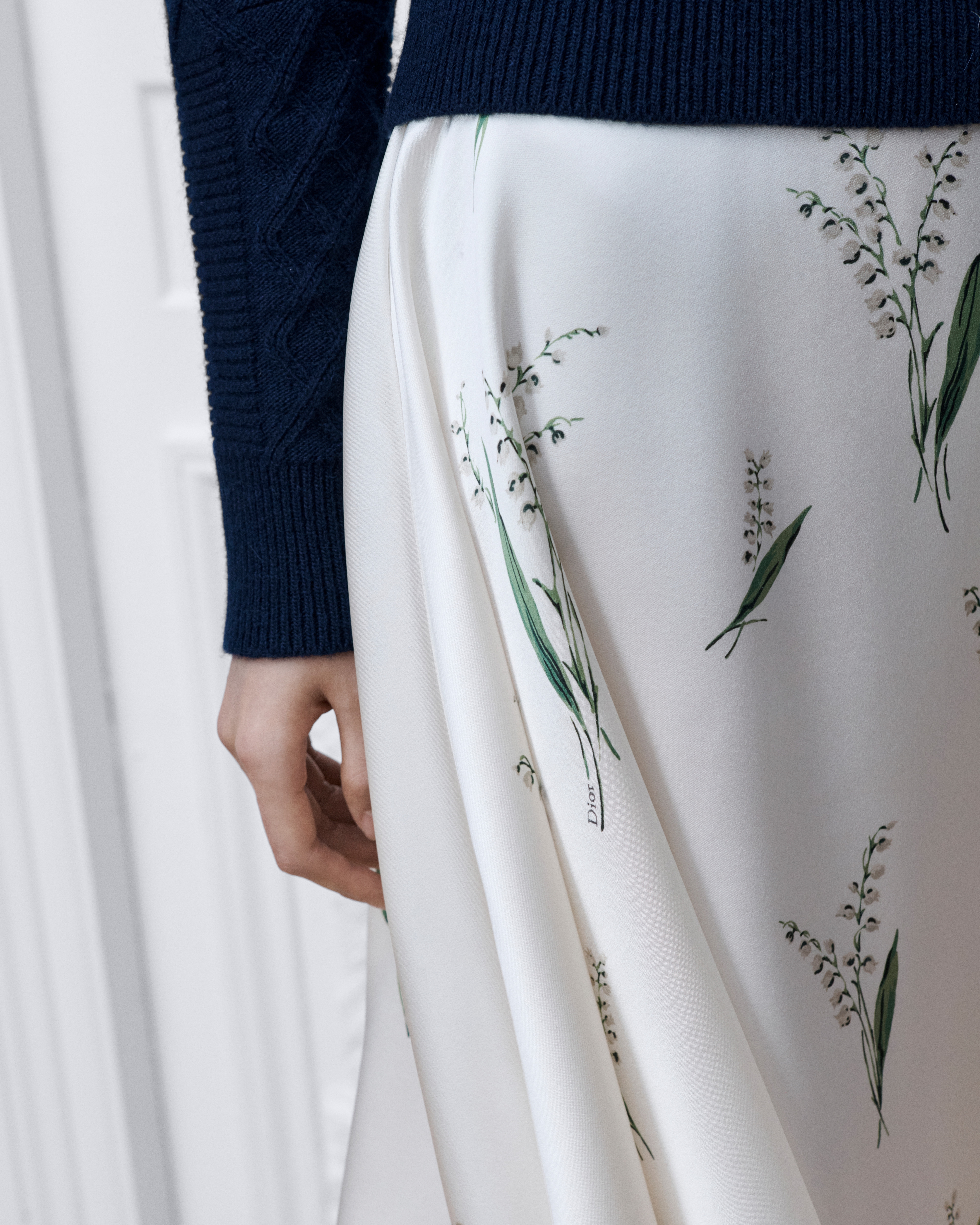Esta falda de largo medio forma parte de la primera colección de Jonathan Anderson para la Maison y ofrece una nueva versión de la silueta Dior que muestra el motivo Lily of the Valley verde en homenaje al símbolo de la suerte de Monsieur Dior y al legado de buena fortuna de la Maison. Se ha confeccionado en seda blanca y ofrece un elegante diseño acampanado hasta la rodilla. El modelo puede combinarse con otras creaciones Lily of the Valley para completar el look.