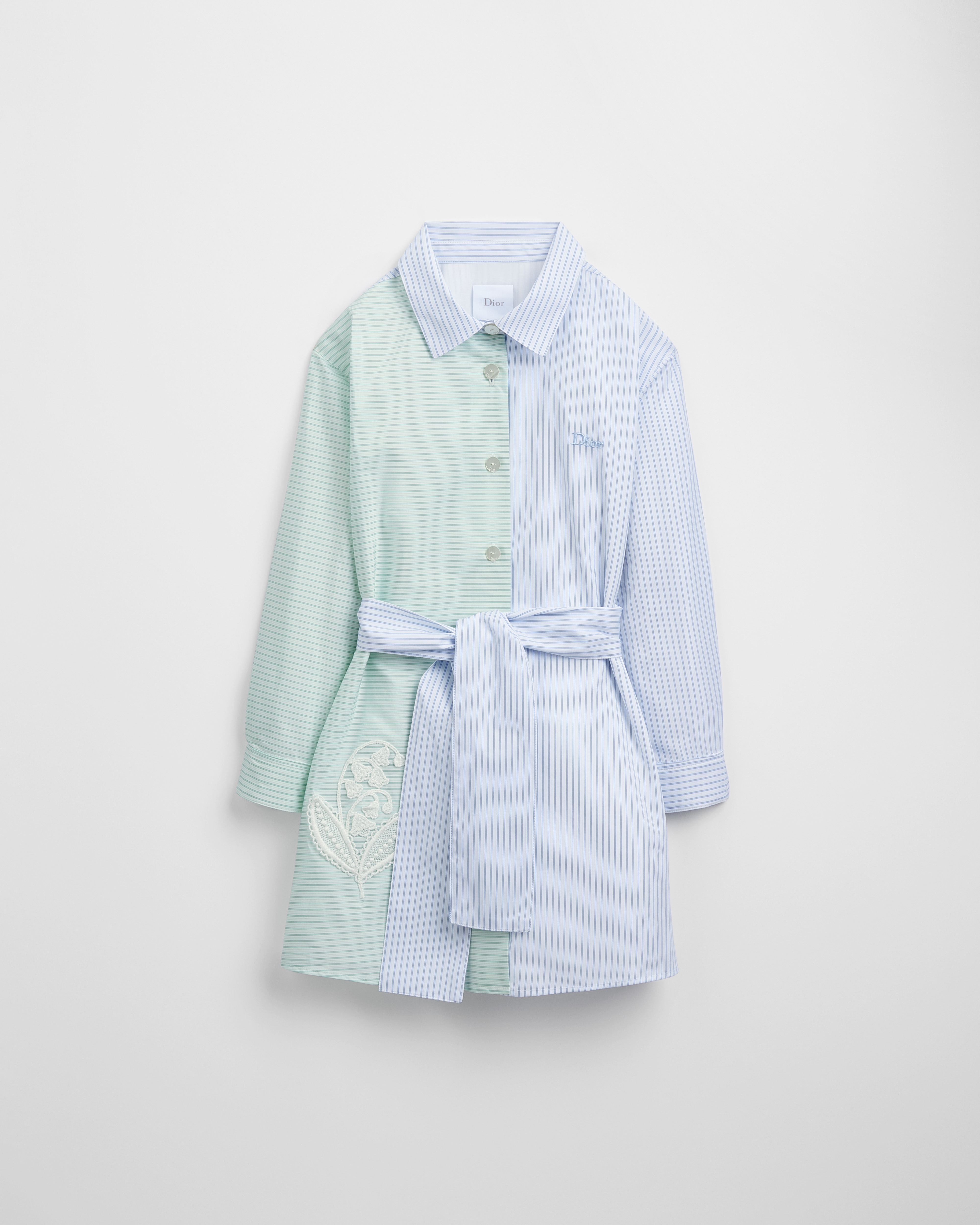 Este vestido camisero, novedad de la temporada Otoño 2026, se distingue por su efecto gráfico asimétrico. Se ha elaborado en popelina de algodón marfil con rayas azules y verdes y se ha realzado con un parche con el motivo Lily of the Valley calado y pespunteado en la parte inferior y un bordado Dior en la parte delantera. Se abrocha con botones blancos y presenta un corte regular con cuello clásico y cinturón de atar. La pieza se puede llevar con unas sneakers de la colección y creará un look fresco y alegre.
