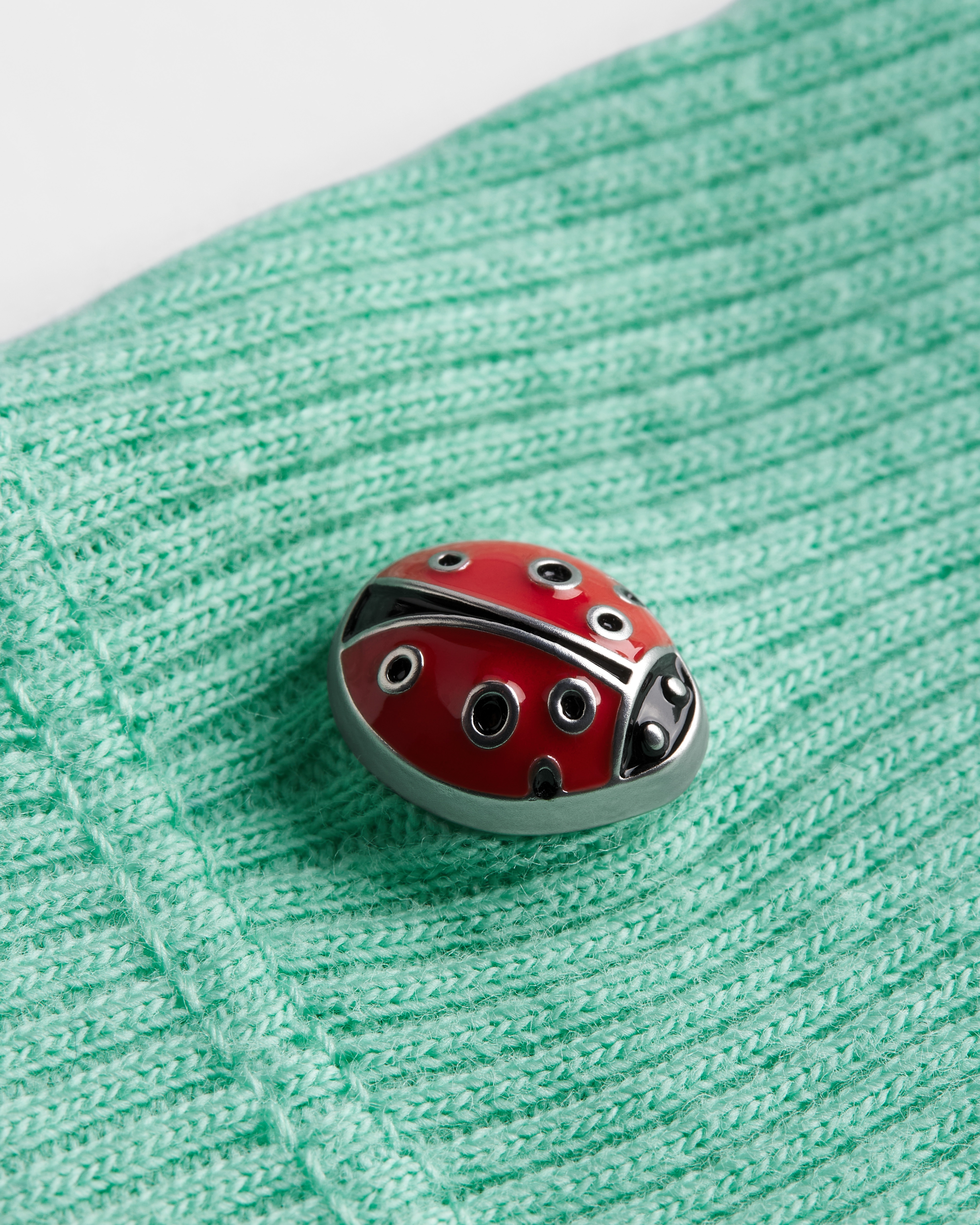 Remache de mariquita rojo en el lado derecho del dobladillo