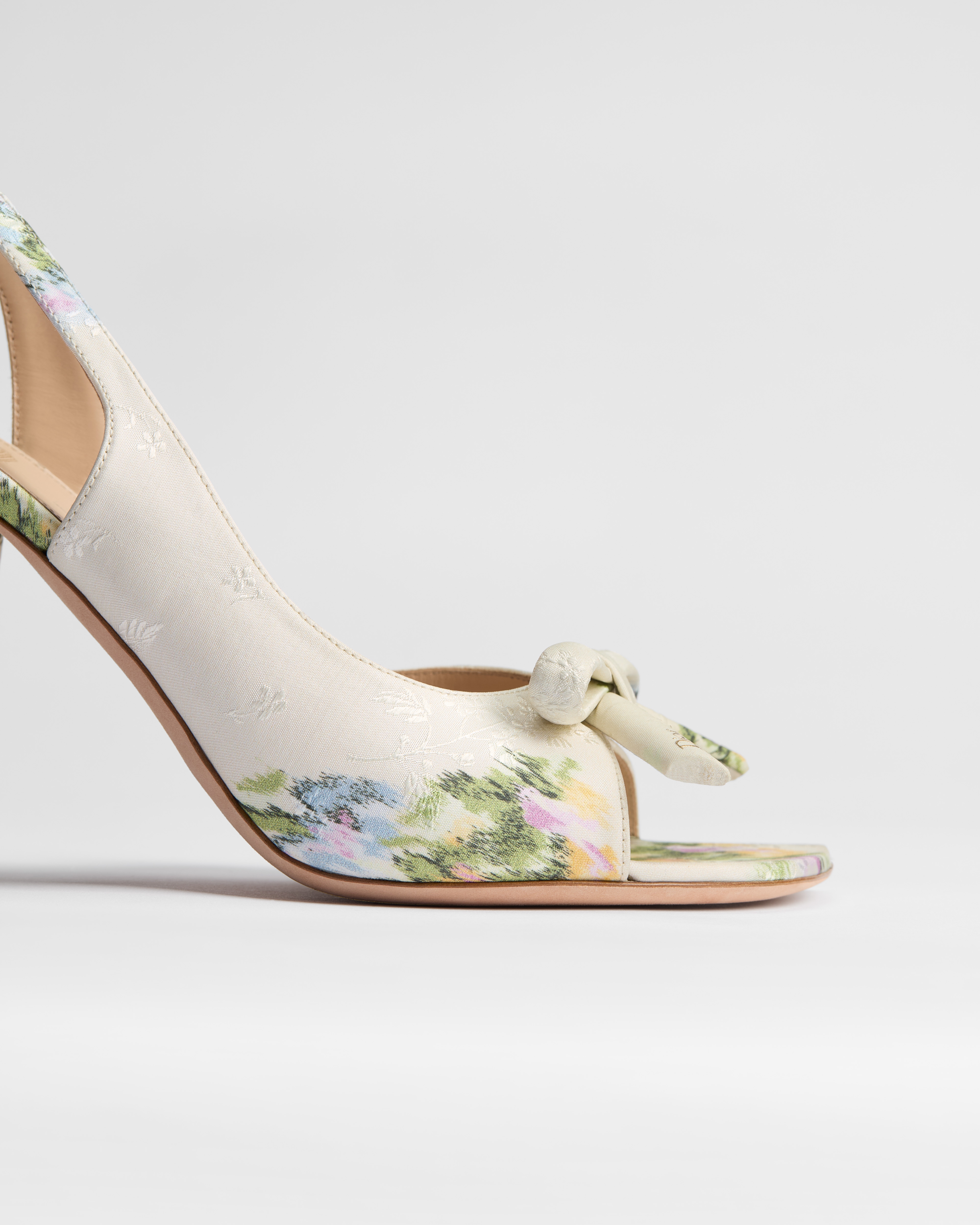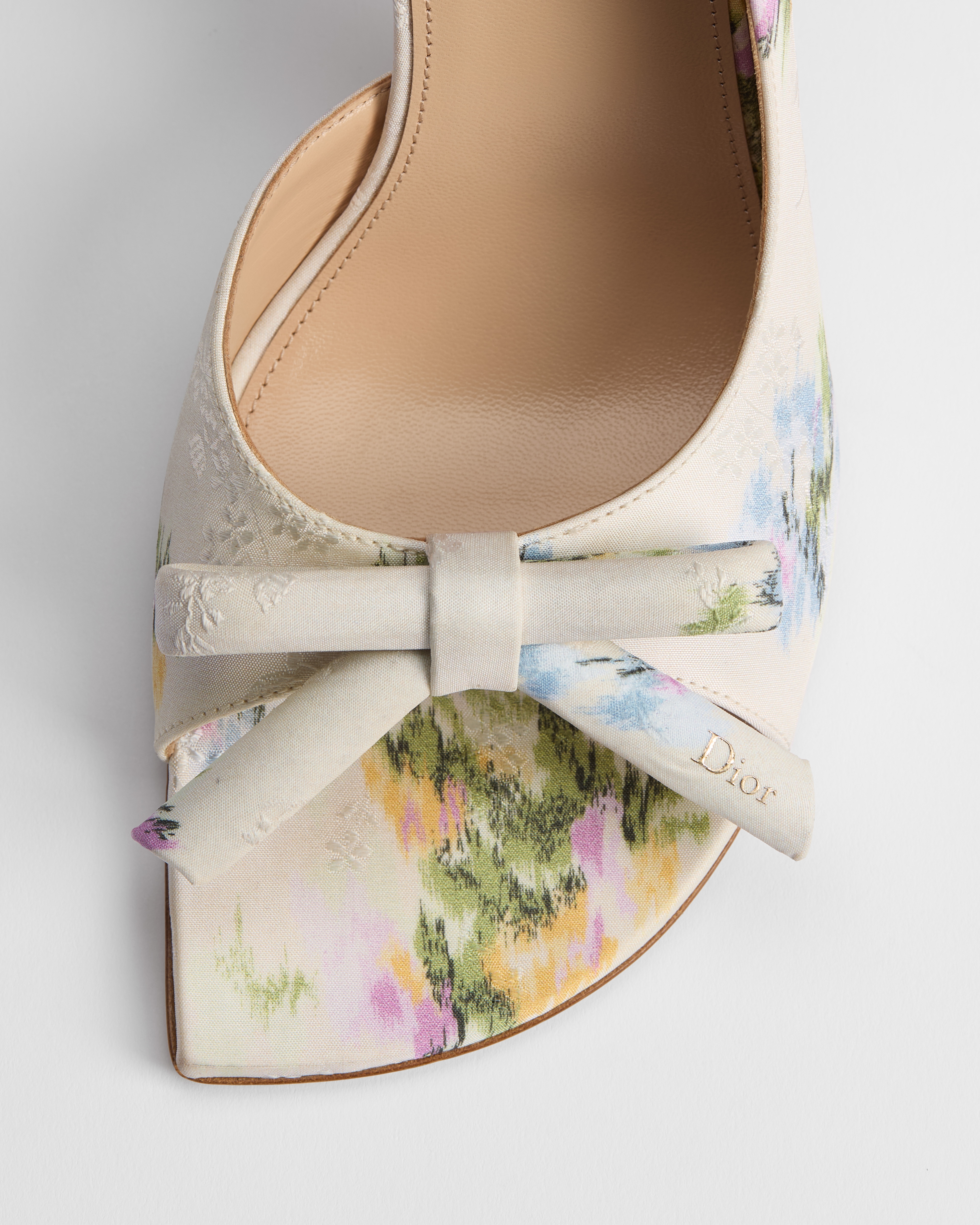 Esta sandalia slingback de tacón Dior Bow, diseñada por Jonathan Anderson, rinde homenaje a la elegancia a través de uno de los símbolos eternos de la Maison: el lazo. El motivo Dior Secret Garden, inspirado en tapices florales clásicos, ofrece un toque poético y refinado. Este elegante zapato, realzado por una suela con forma de D de Dior, encarna una sublime expresión de refinamiento.