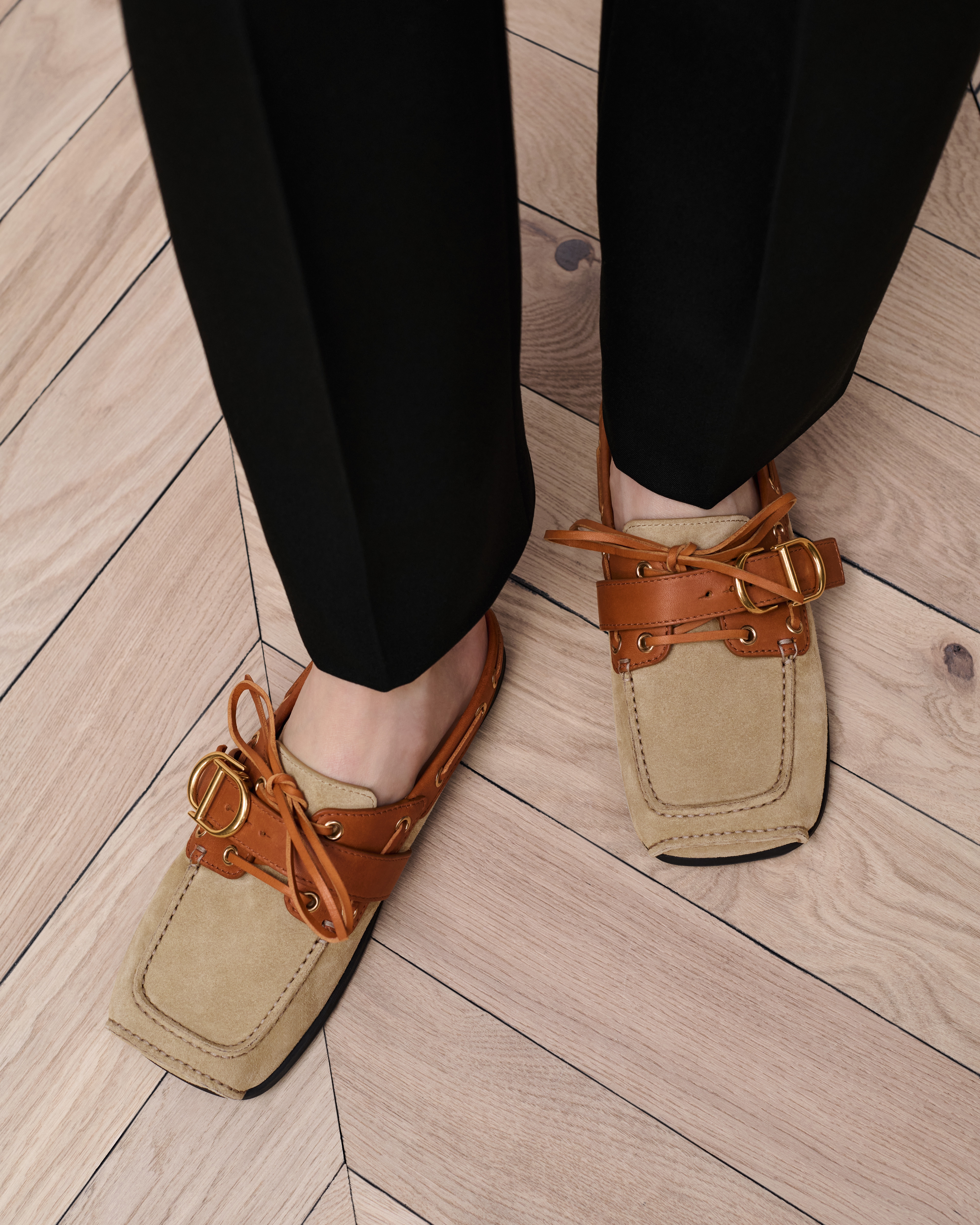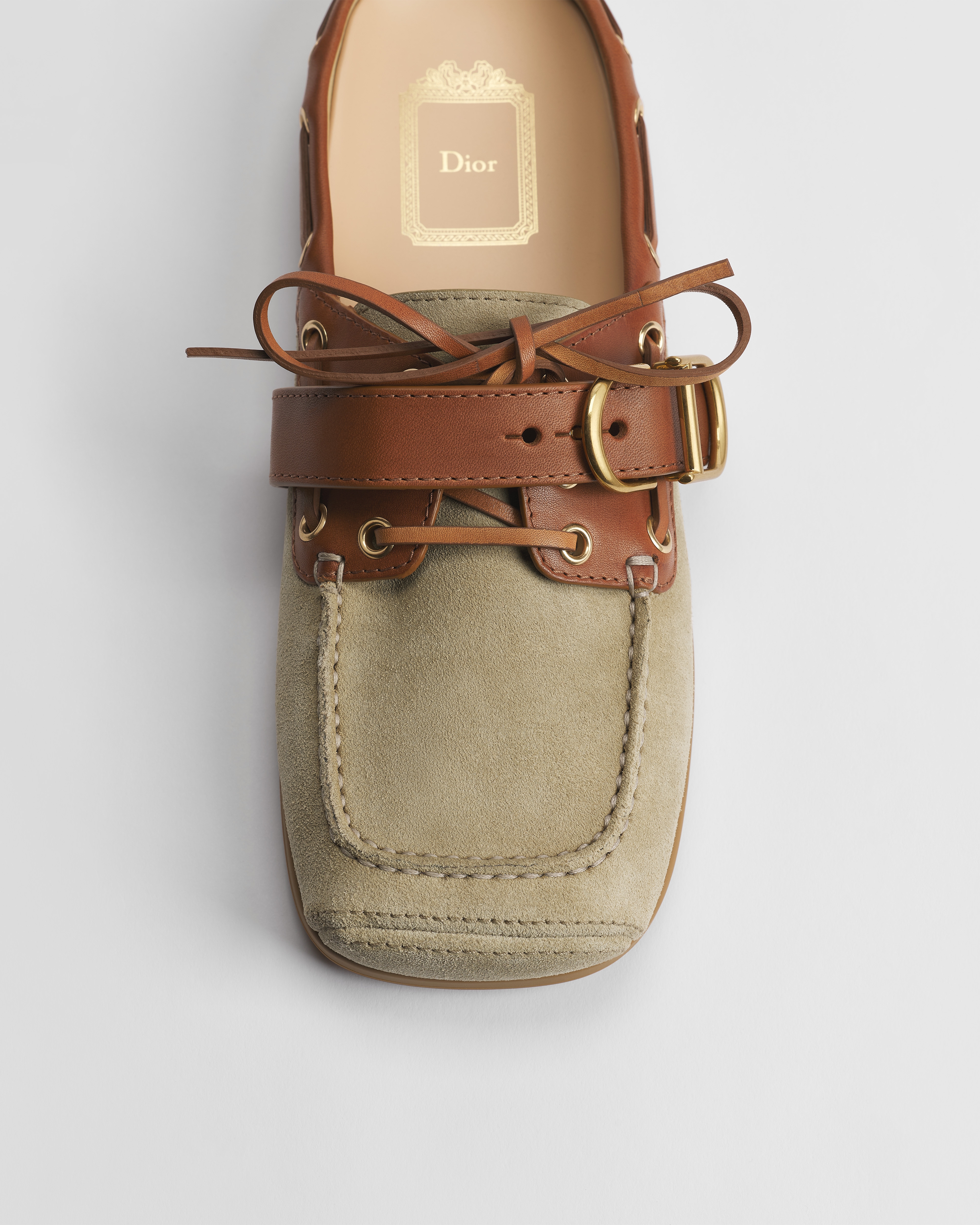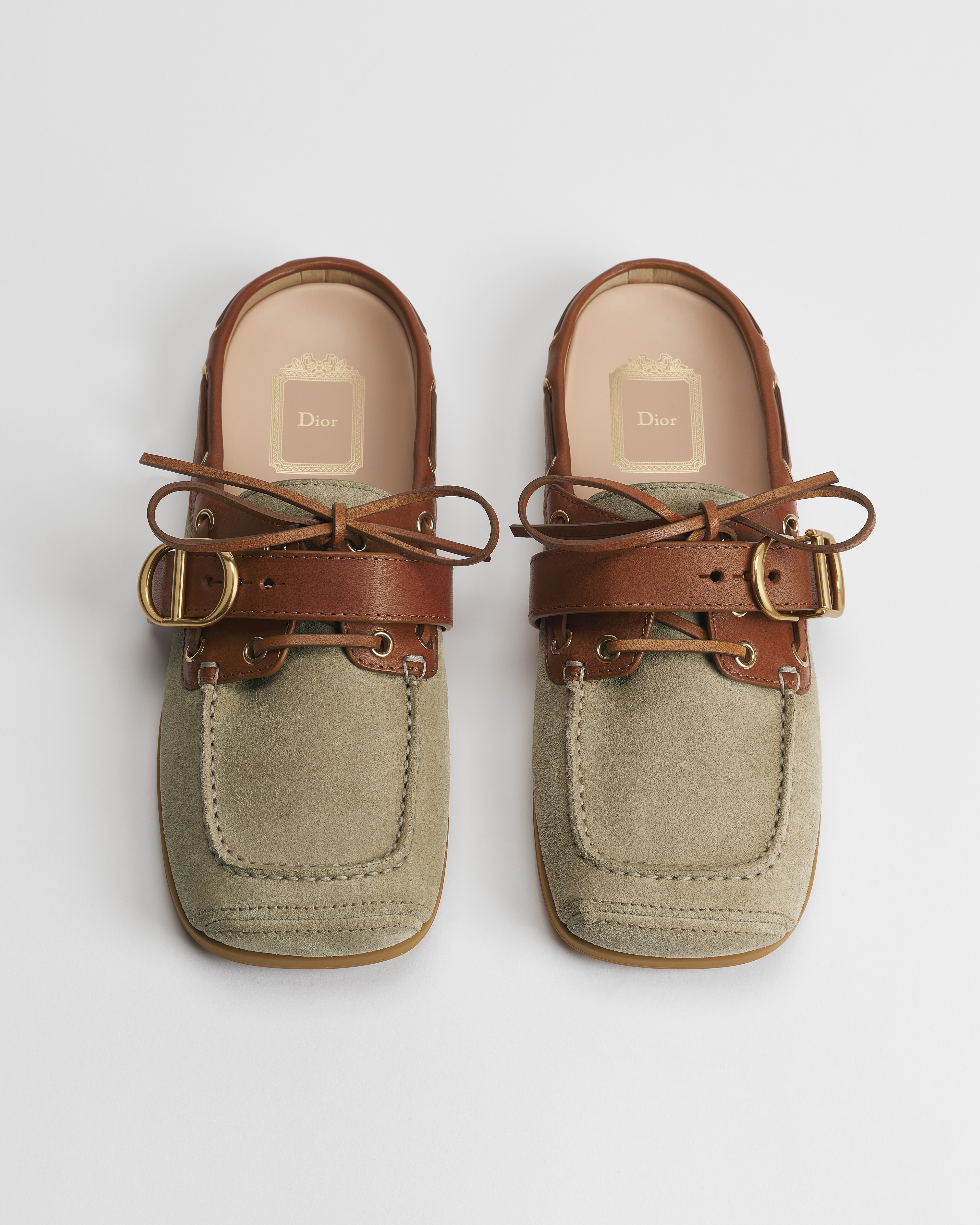 Jonathan Anderson se inspira en el mundo náutico para el diseño de este mule Dior Voile, que combina elegancia y comodidad. La silueta de dos materiales, confeccionada en ante de piel de becerro y piel de becerro e ideal para completar un conjunto veraniego, se inspira en los códigos de la moda masculina con una moderna puntera cuadrada y una hebilla CD.