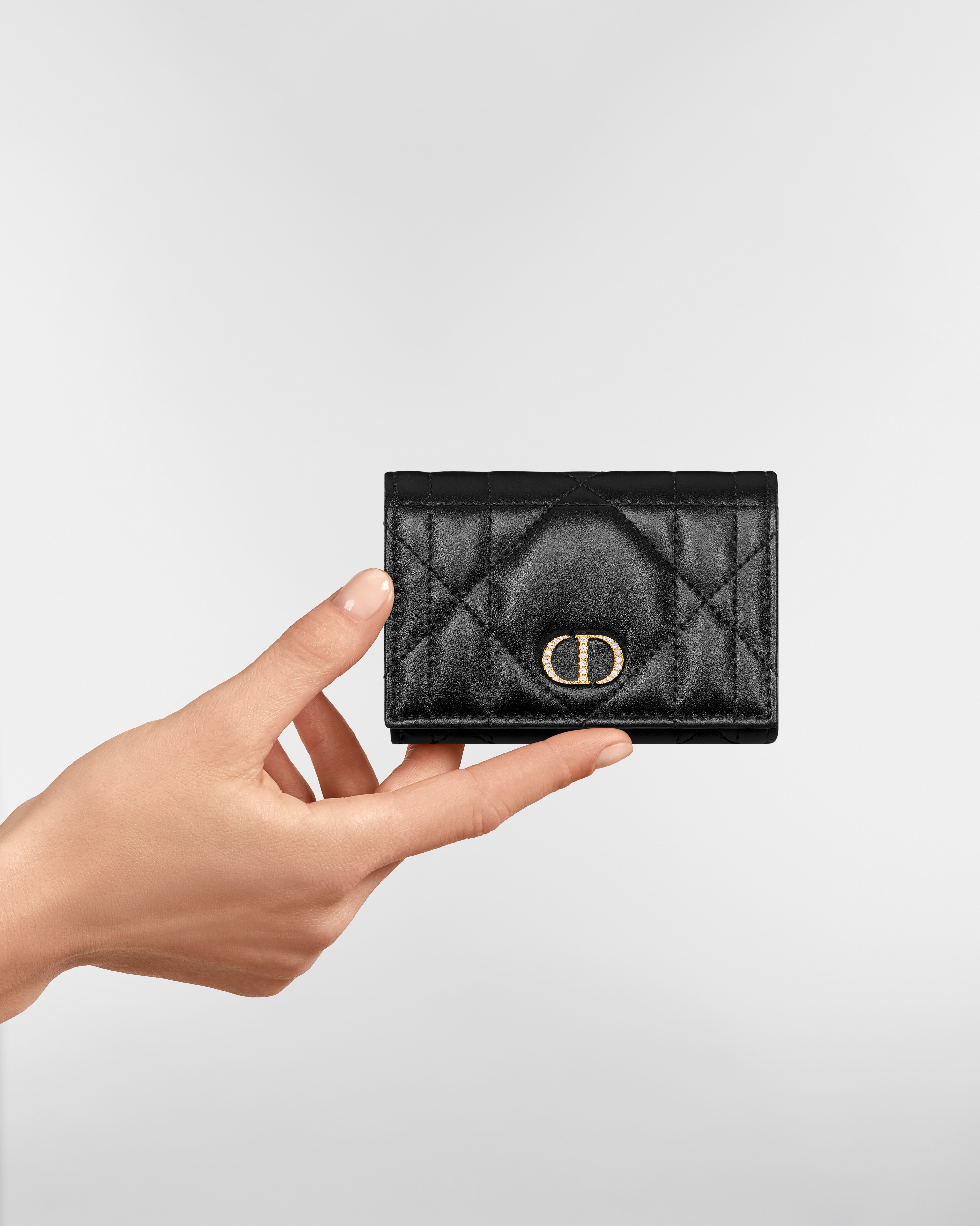 Esta cartera Dior Caro Glycine, novedad de la temporada Invierno 2025, se distingue por su diseño compacto y práctico. Se ha confeccionado en piel de cordero negra sublimada con pespuntes Macrocannage y se ha adornado en la parte delantera con la firma CD de metal dorado, realzada con delicados cristales blancos engastados. Este accesorio refinado es ideal para transportar sus objetos esenciales y puede llevarse en el bolsillo o en cualquier bolso, así como combinarse con otras creaciones Dior Caro.