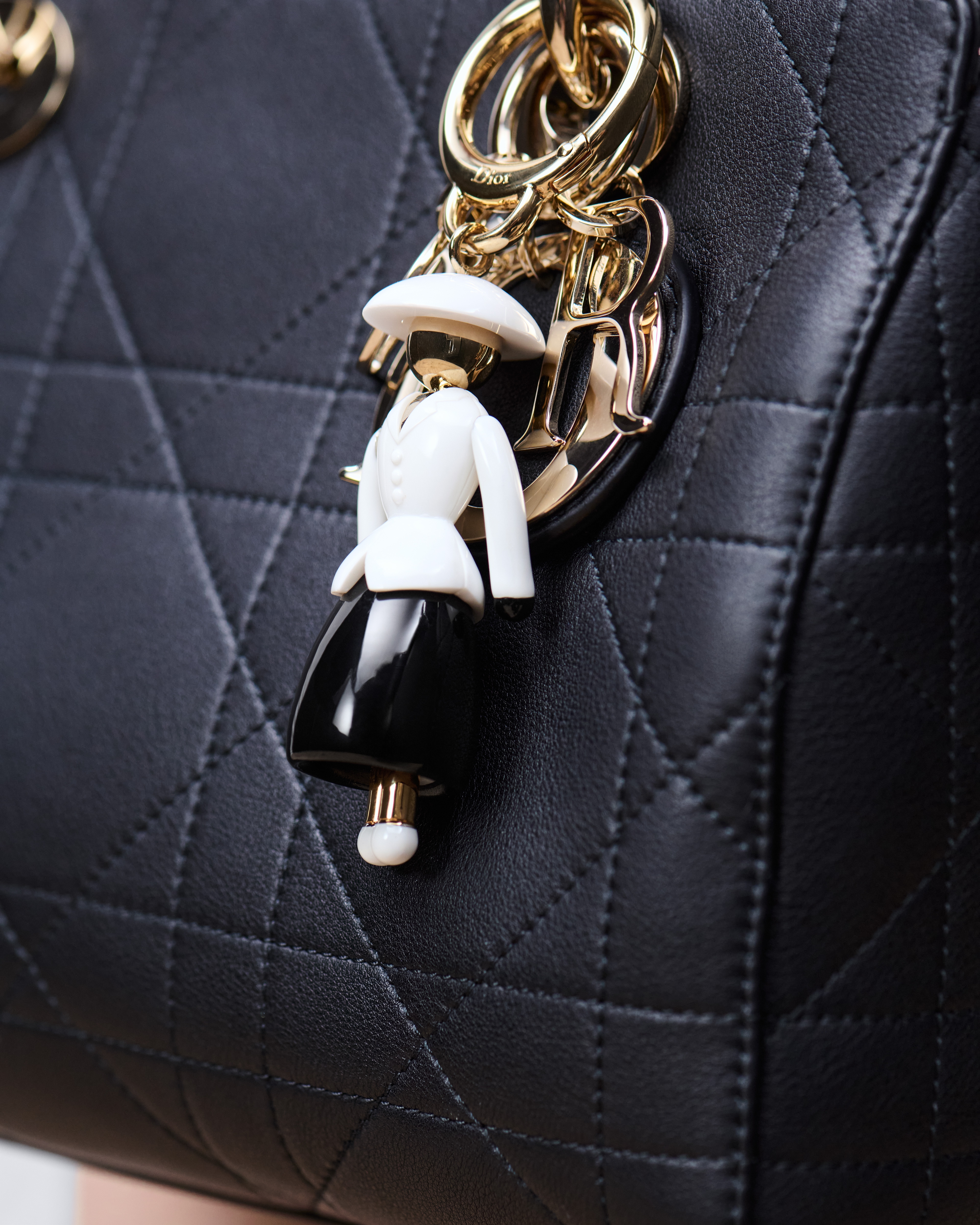 Este charm para bolso Dior Icon, diseñado por Jonathan Anderson, rinde homenaje a la elegancia escultórica de la silueta New Look, creada por Christian Dior en 1947. El diseño de metal dorado muestra una figura de resina vestida con la emblemática chaqueta Bar blanca y una falda entallada negra. Este accesorio aportará un toque de fantasía a cualquier bolso y puede combinarse con otras creaciones de la línea Dior Icon.