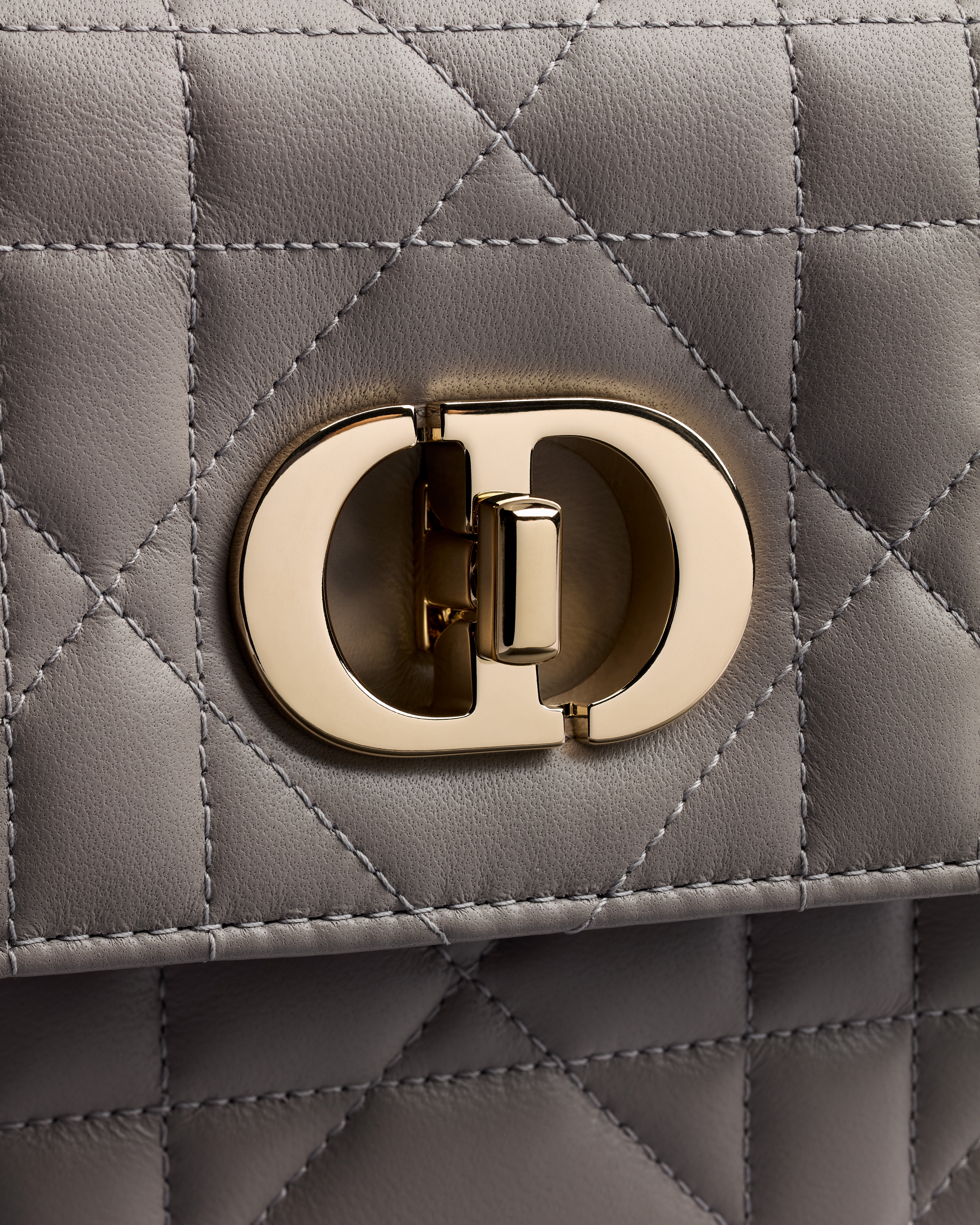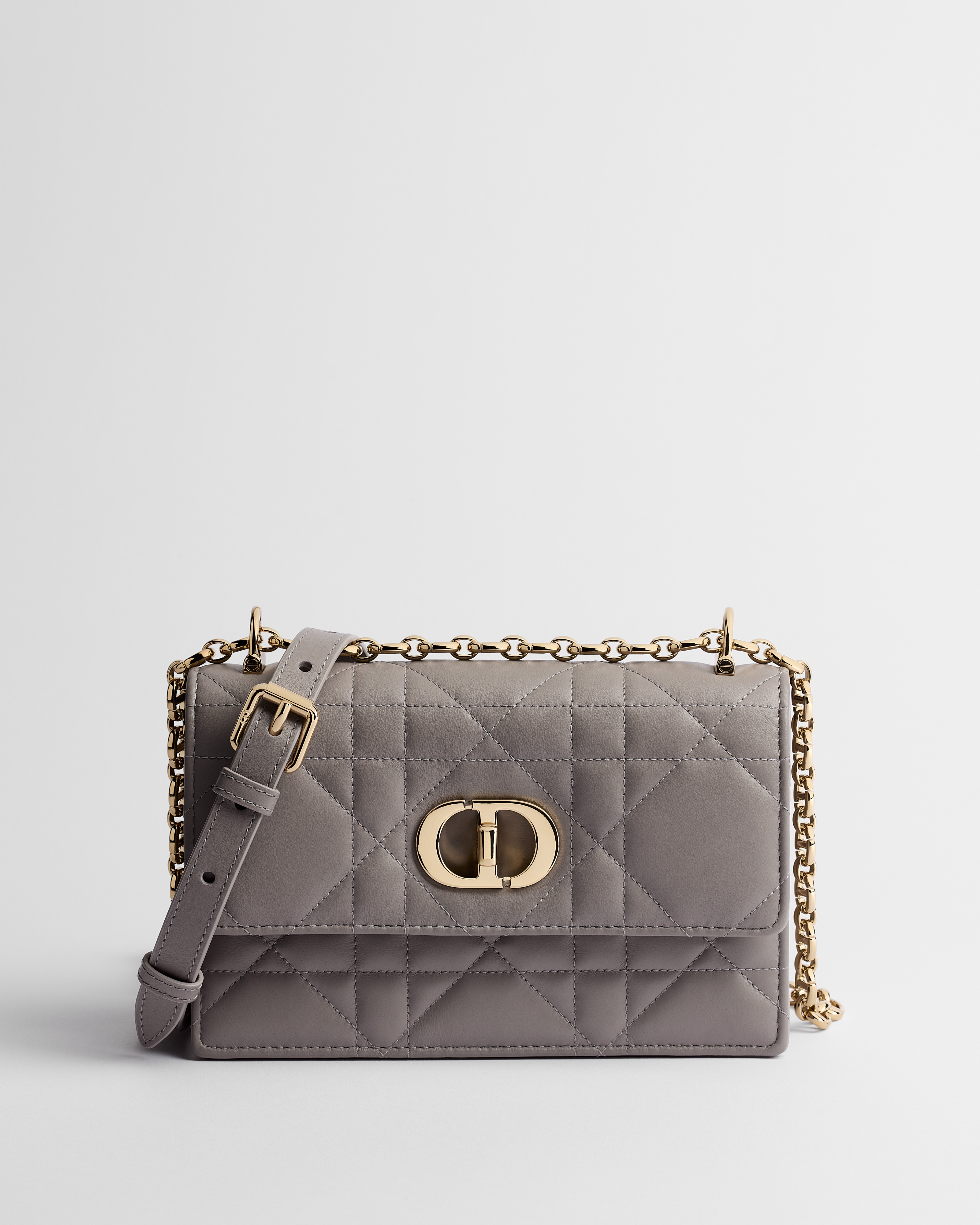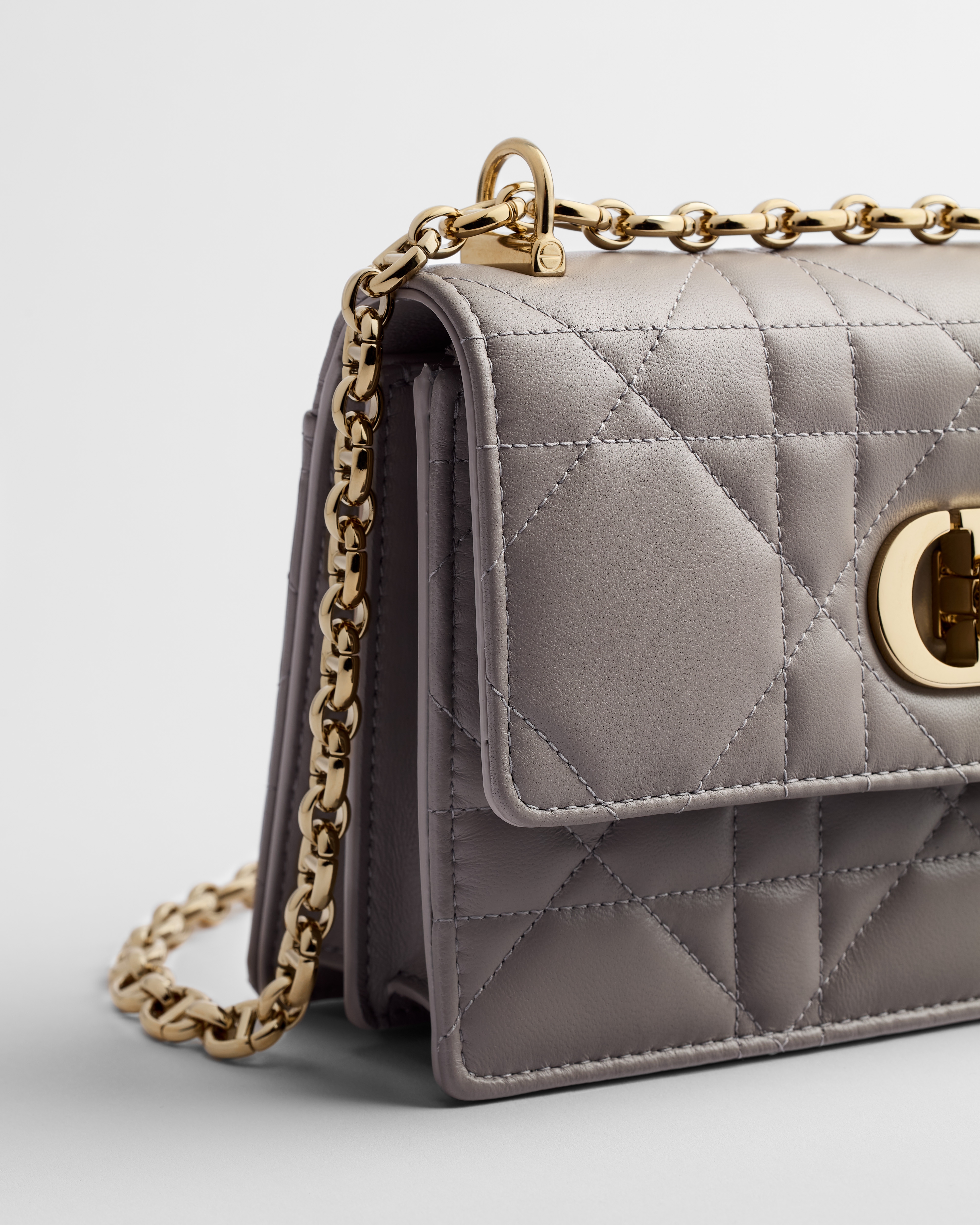 Le mini sac Miss Caro, une création alliant modernité et élégance intemporelle, vient enrichir la ligne Dior Caro. Ce modèle en cuir d'agneau gris Trianon à surpiqûres Macrocannage est doté d'un rabat ponctué d'un fermoir twist CD en métal doré pâle, inspiré d'un flacon de parfum Christian Dior. Sa bandoulière chaîne ajustable dotée d'un empiècement en cuir offrira un porter confortable à la main, à l'épaule ou en crossbody.