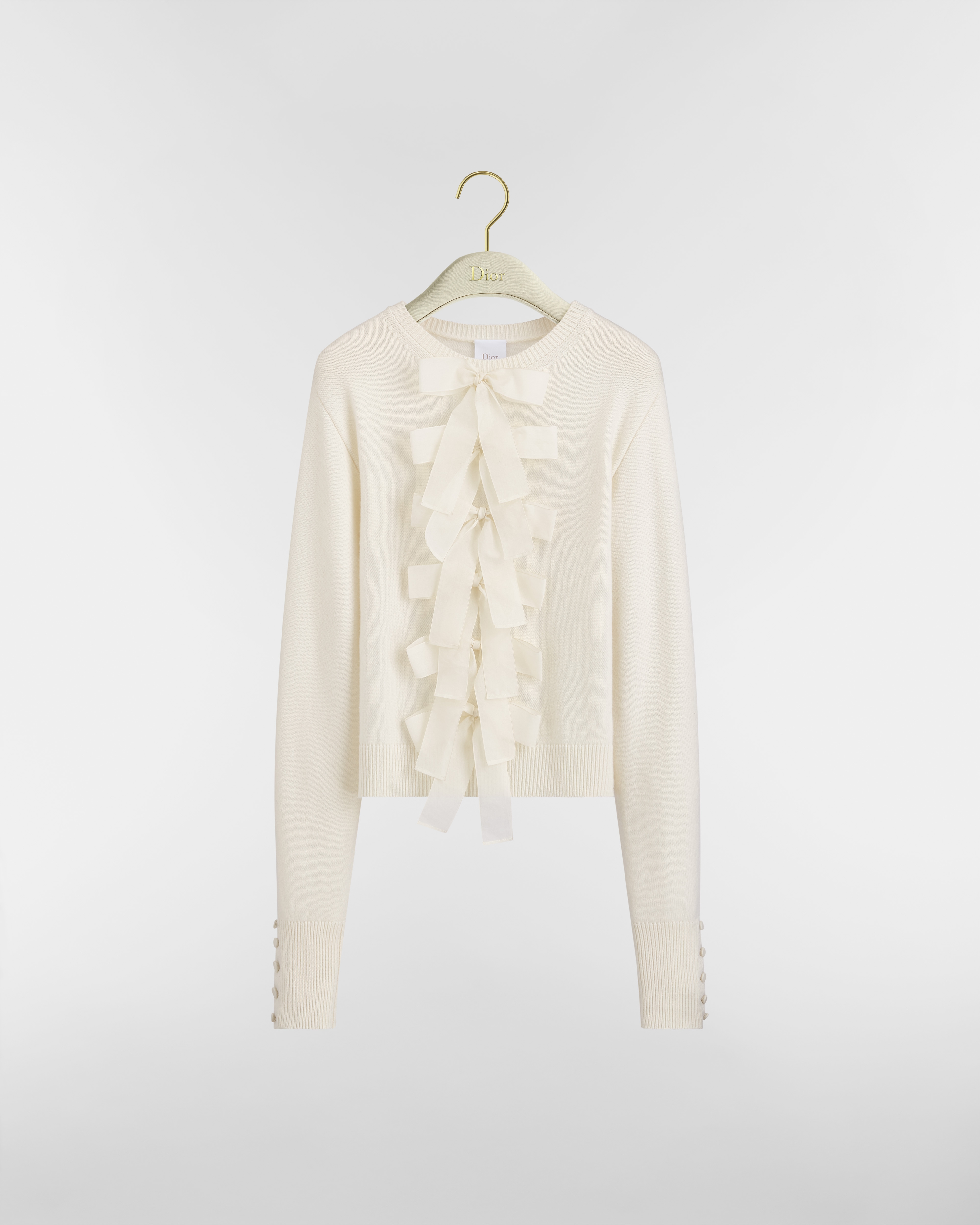 Le pull s'invite comme une création moderne au look couture. Confectionné en maille de laine et cachemire écrus, il dévoile une coupe droite, sublimée par de délicats nœuds en soie ton sur ton, dont l'un est orné de la signature Dior Oblique en métal argenté à l'encolure. Complété de finitions côtelées et de poignets boutonnés, ce pull apportera une touche raffinée à tous les looks de saison.