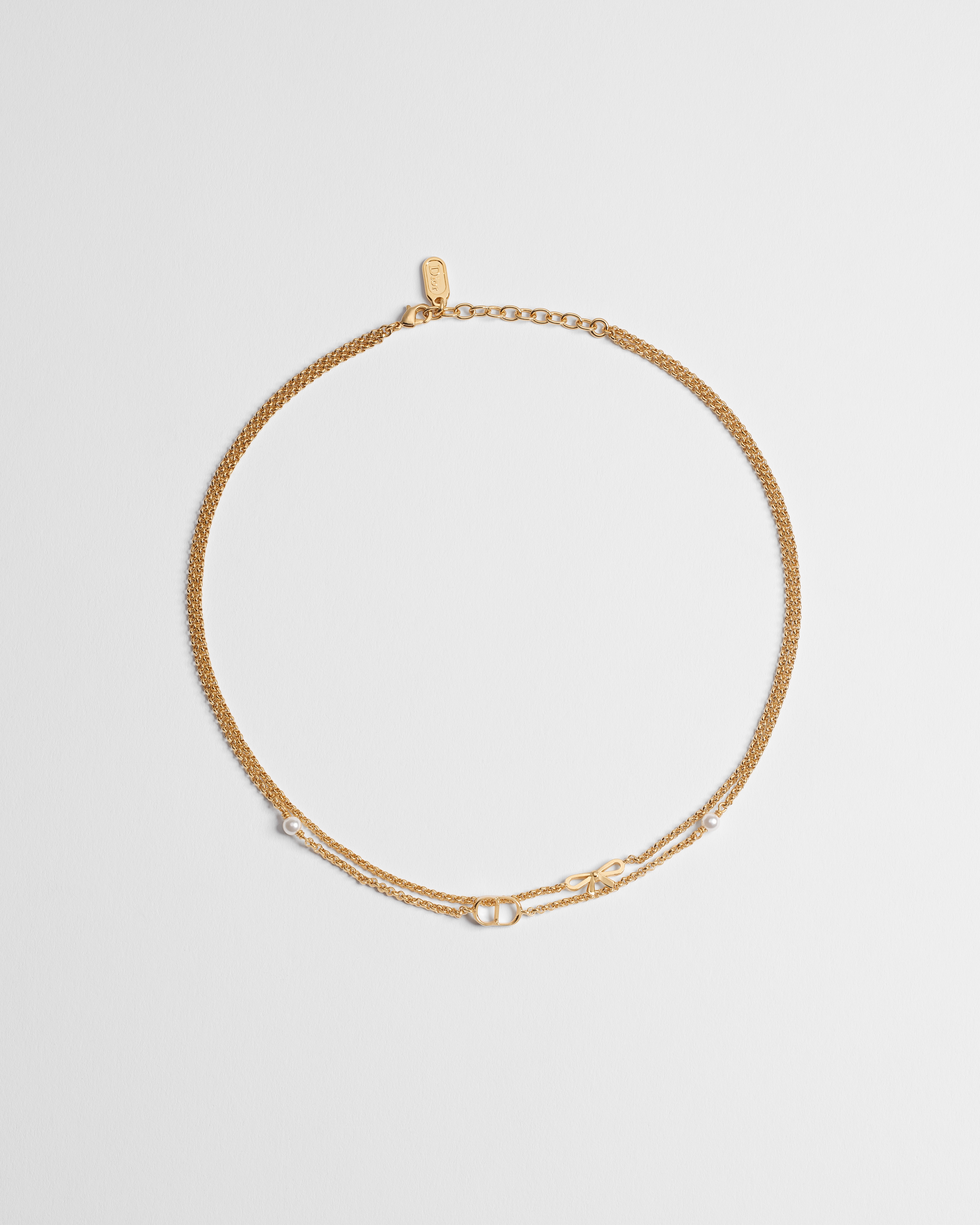 Jonathan Anderson réinterprète le nœud emblématique de la Maison avec le collier CD Mini Bow incarnant une féminité contemporaine et raffinée. Son design double en métal finition dorée est ponctué de perles en résine blanche, ainsi que d'un délicat nœud et dévoile la signature CD. Ce collier s'associera harmonieusement aux autres créations de la ligne CD Mini Bow.