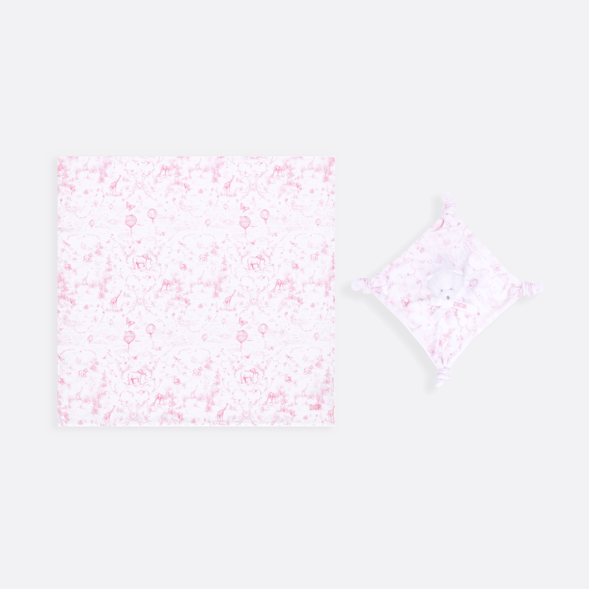 Le coffret de naissance met à l'honneur l'emblématique motif Toile de Jouy de la Maison. Il se compose d'un lange en interlock et mousseline de coton blanc, ainsi que d'un doudou ourson en velours de coton blanc, tous les deux imprimés rose pâle. Ponctué d'une broderie Dior sur chaque pièce, ce coffret intemporel et délicat composera un cadeau de naissance idéal.