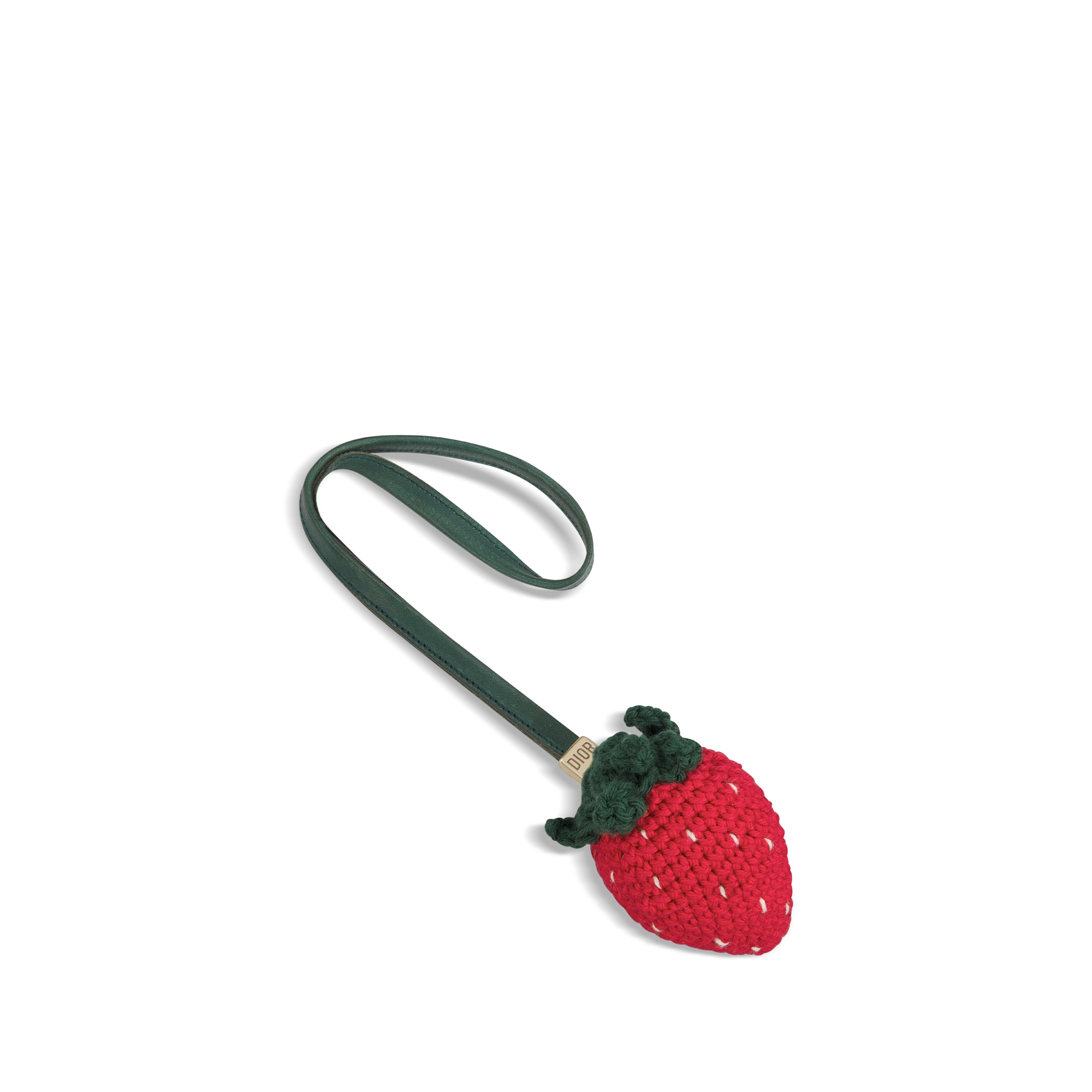 Nouveauté de la saison automne 2025, le charm adopte la forme d'une fraise, un clin d'œil à la gourmandise de Monsieur Dior. Confectionné en maille de coton rouge et vert, il est doté d'une lanière fixe en tissu aspect cuir vert. Ponctué d'un rivet en métal doré avec signature Dior, il complétera les sacs de la collection d'une touche originale et ludique.