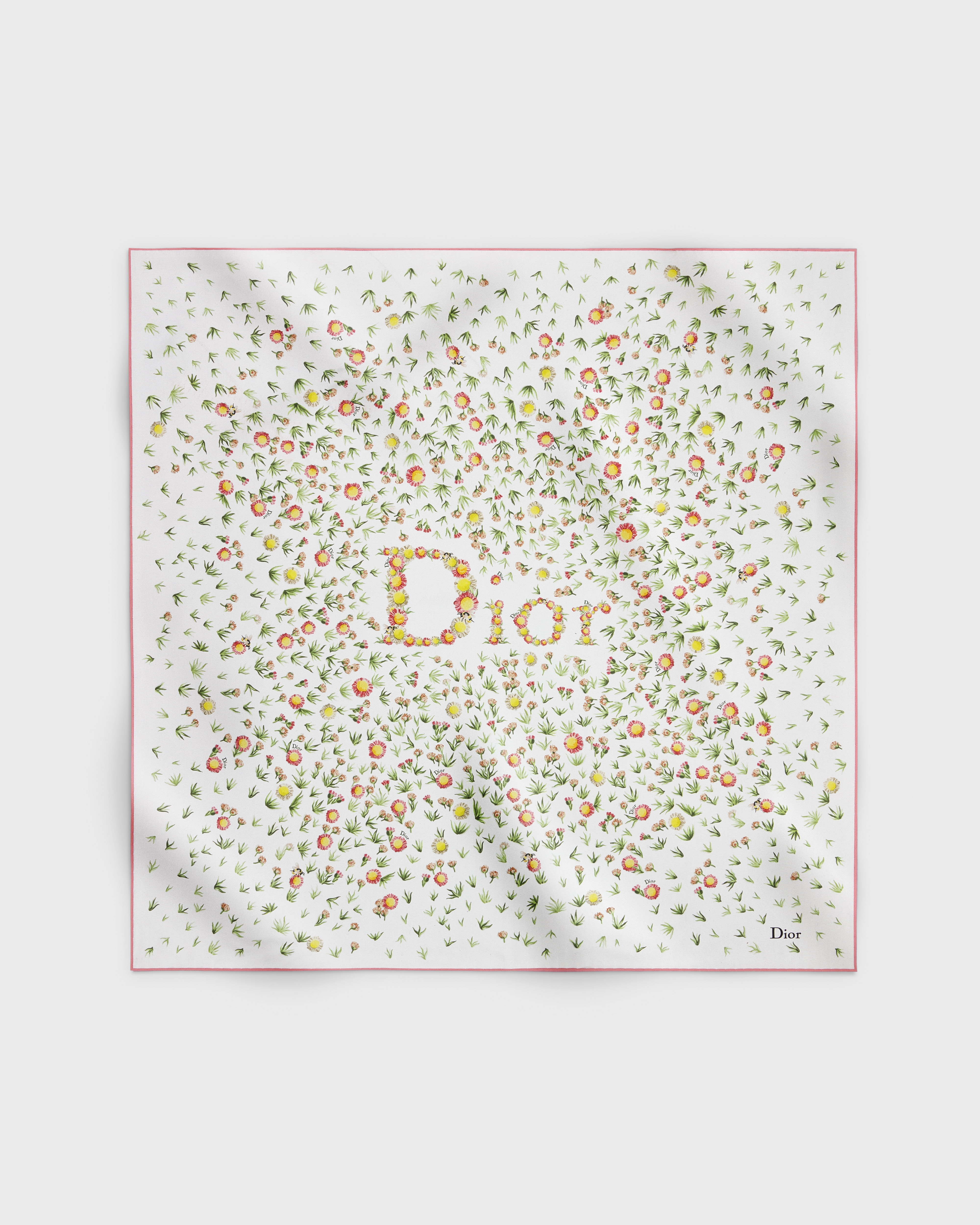 Le carré présente l'imprimé Daisy Garden mettant à l'honneur la marguerite dans un décor bucolique et coloré célébrant l'héritage floral de la Maison. Confectionné en twill de soie blanche multicolore, ce modèle à bords contrastés et roulottés à la main est rehaussé de la signature Dior fleurie. Ce carré pourra être porté autour du cou ou noué sur la tête pour un total look Dior.