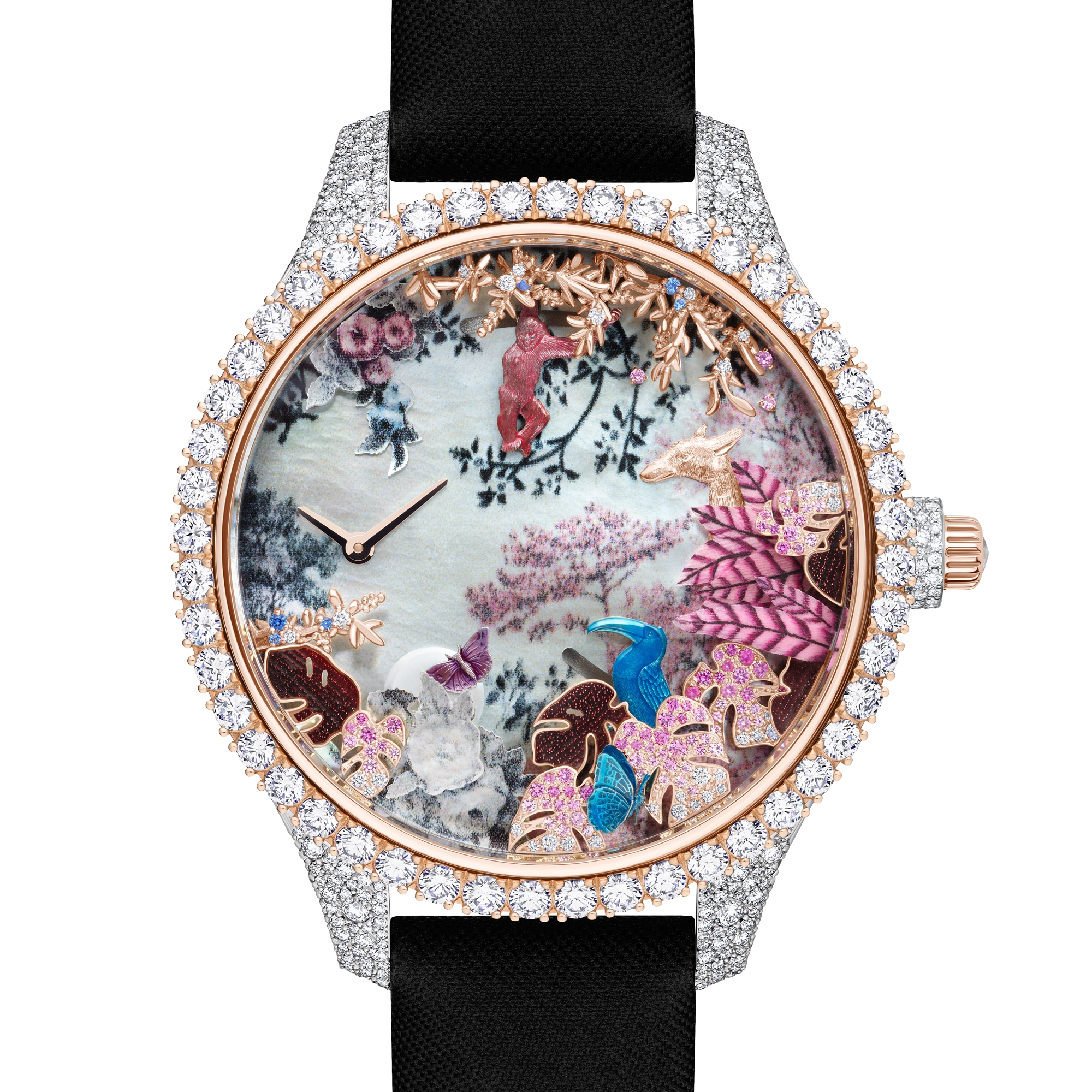 Ø 38 mm, or blanc, or rose, diamants, saphirs bleus, nacre, plumes et scarabée