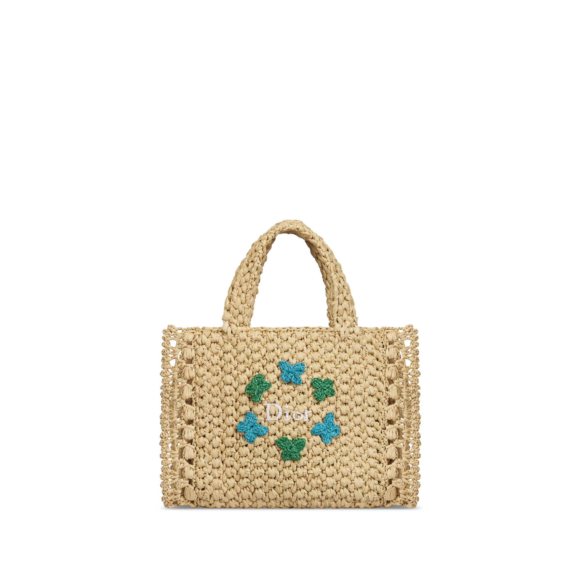 Nouveauté de la saison été 2026, le sac à main adopte une forme moderne et originale. Confectionné en raphia couleur naturel, il est composé d'un compartiment unique avec fermeture aimantée. Des papillons brodés verts et bleu lavande, ainsi que la broderie Dior au centre viennent ajouter une touche ludique. Ce sac sera le compagnon idéal des petites filles lors des vacances d'été.