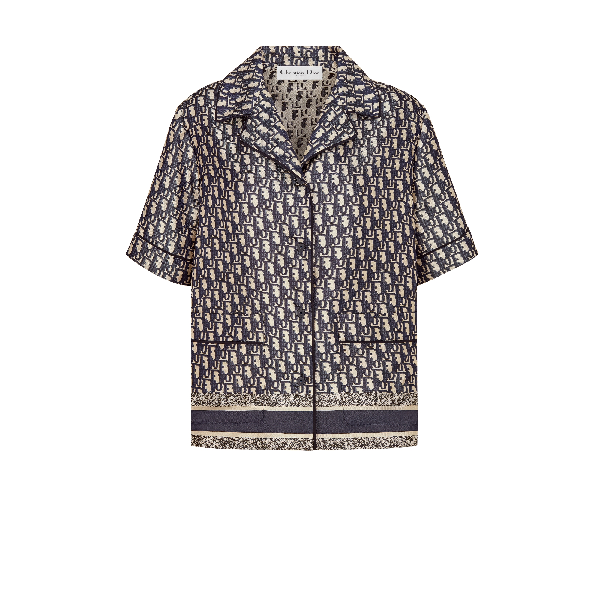 Questa camicia è decorata con l’emblematico motivo Dior Oblique blu. Realizzata in twill di seta, è impreziosita dalla firma Christian Dior a contrasto sull’orlo, mentre la parte anteriore è adornata da una chiusura a bottoni e da due tasche. Questo modello a maniche corte, leggero e ricercato, è ideale da abbinare agli shorts o ai pantaloni coordinati per completare il look.