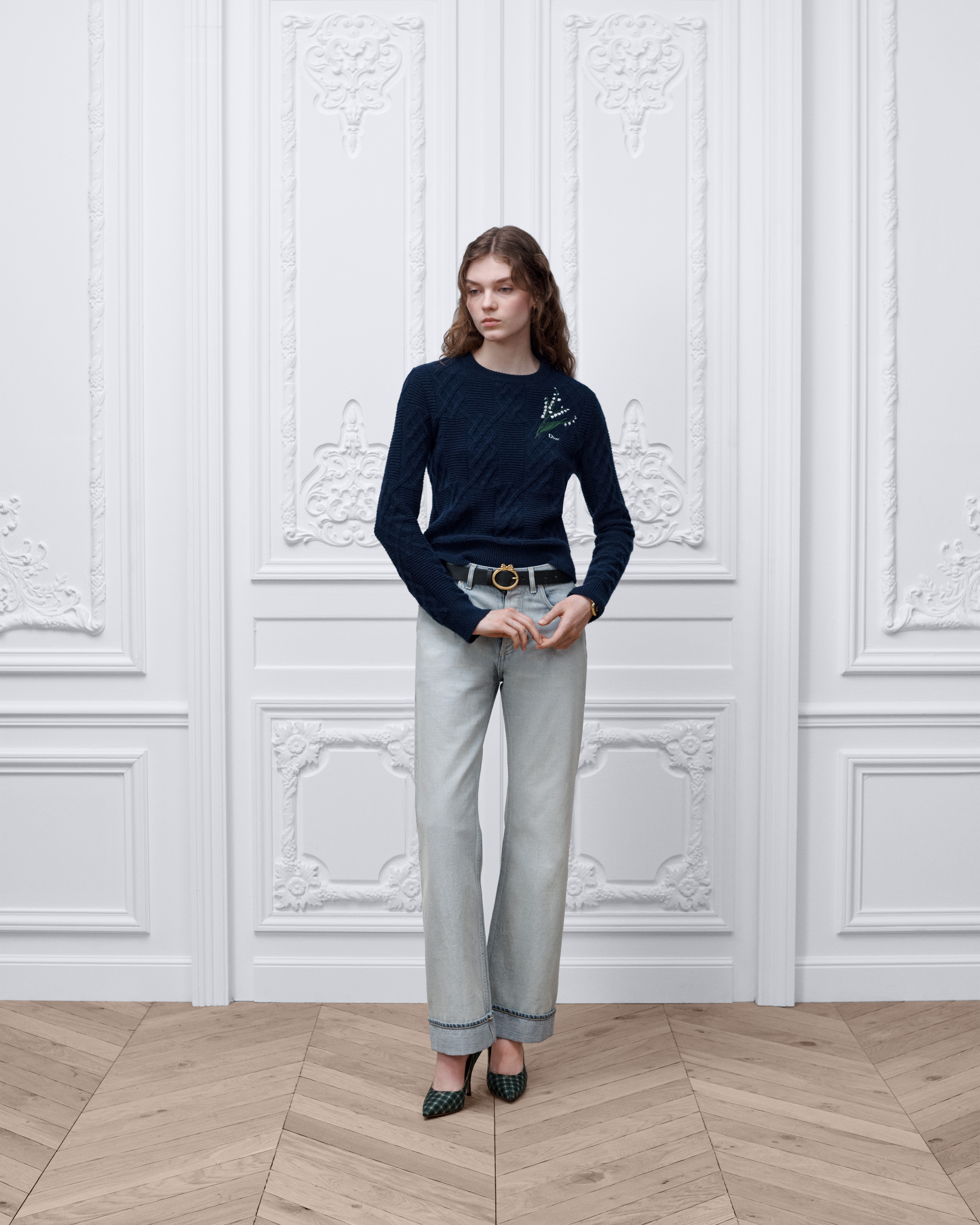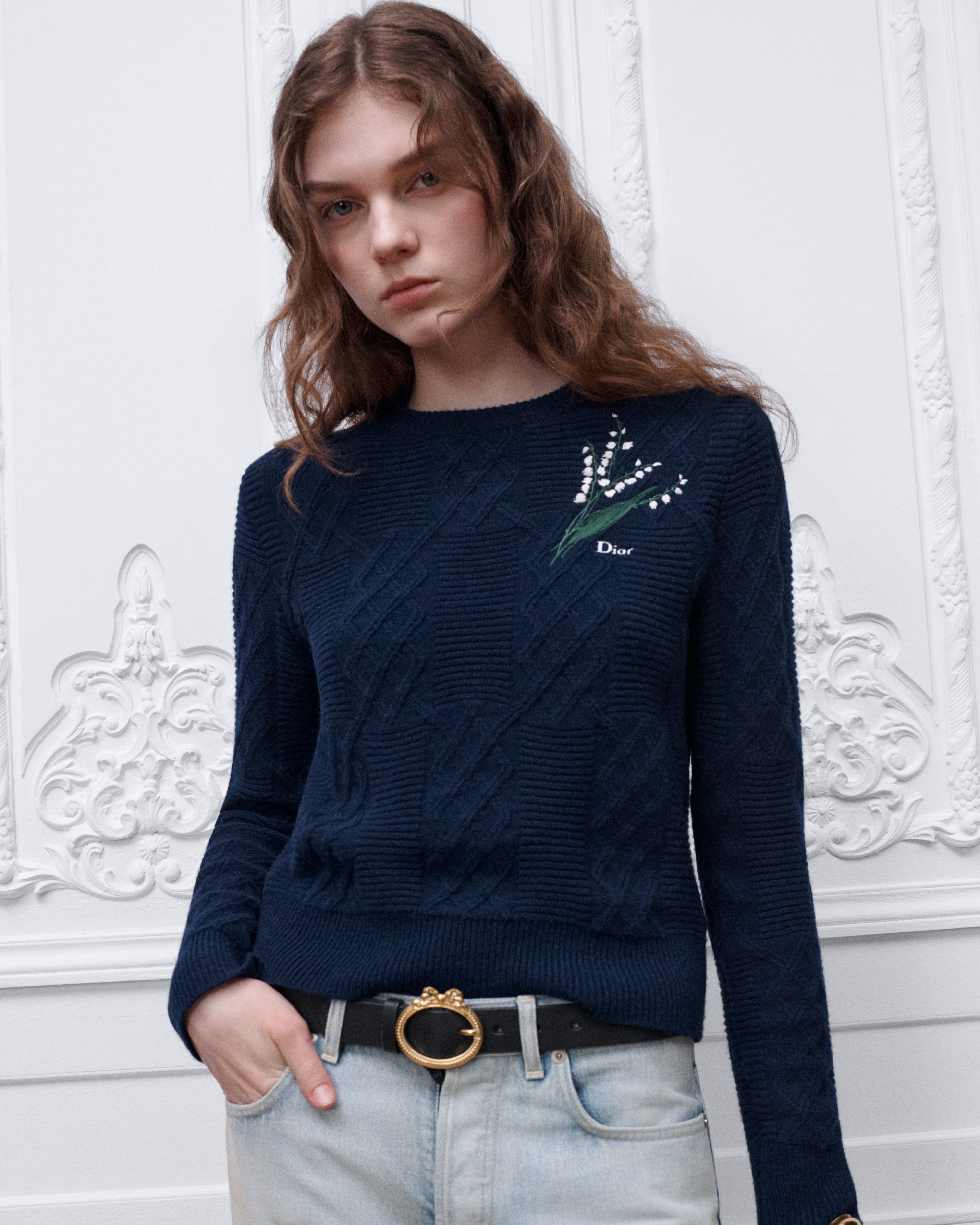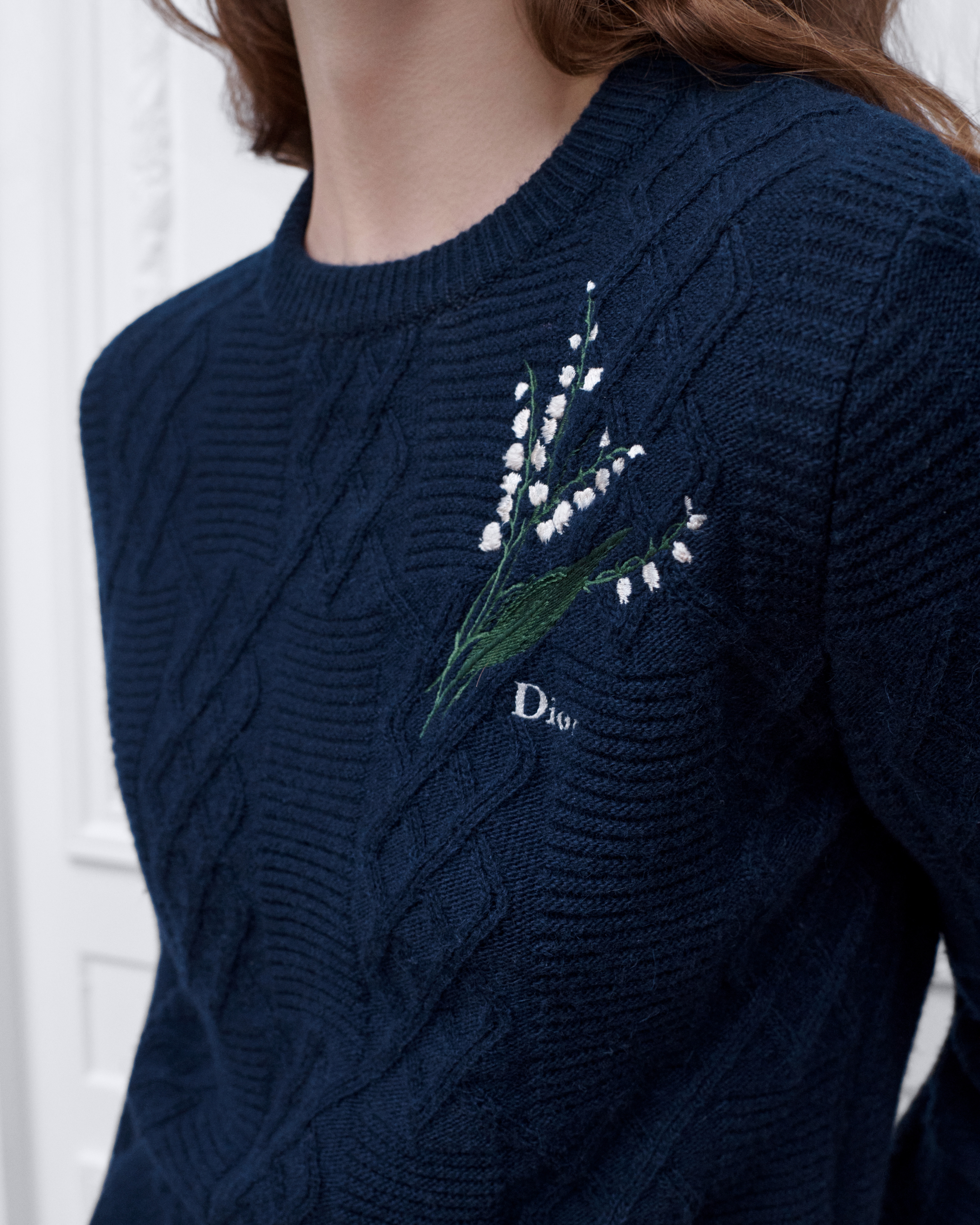 Maglia di lana e alpaca blu navy a trecce con motivo Lily of the Valley