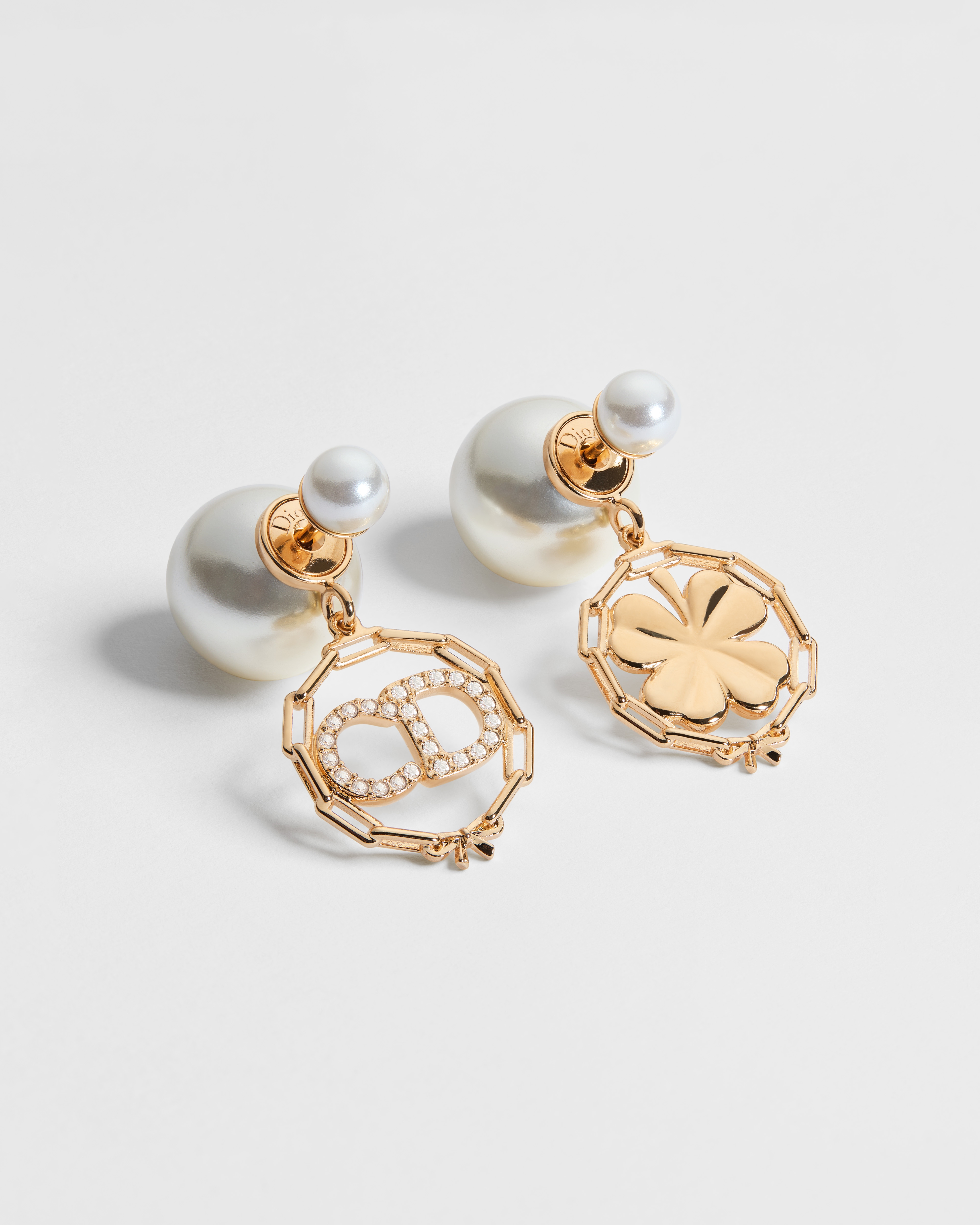 Questi orecchini Dior Tribales si ispirano alla pelletteria della Maison dando vita a un accessorio moderno e raffinato. Le caratteristiche perle in resina sono impreziosite dalla firma CD in pavé di cristalli su un lato e da un quadrifoglio sull’altro, entrambi incorniciati da una catena delicatamente decorata con un fiocco. Sono ideali da abbinare alle altre creazioni della linea CD Circle Chain.