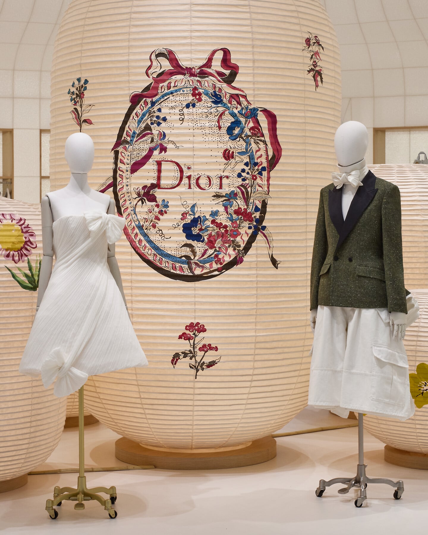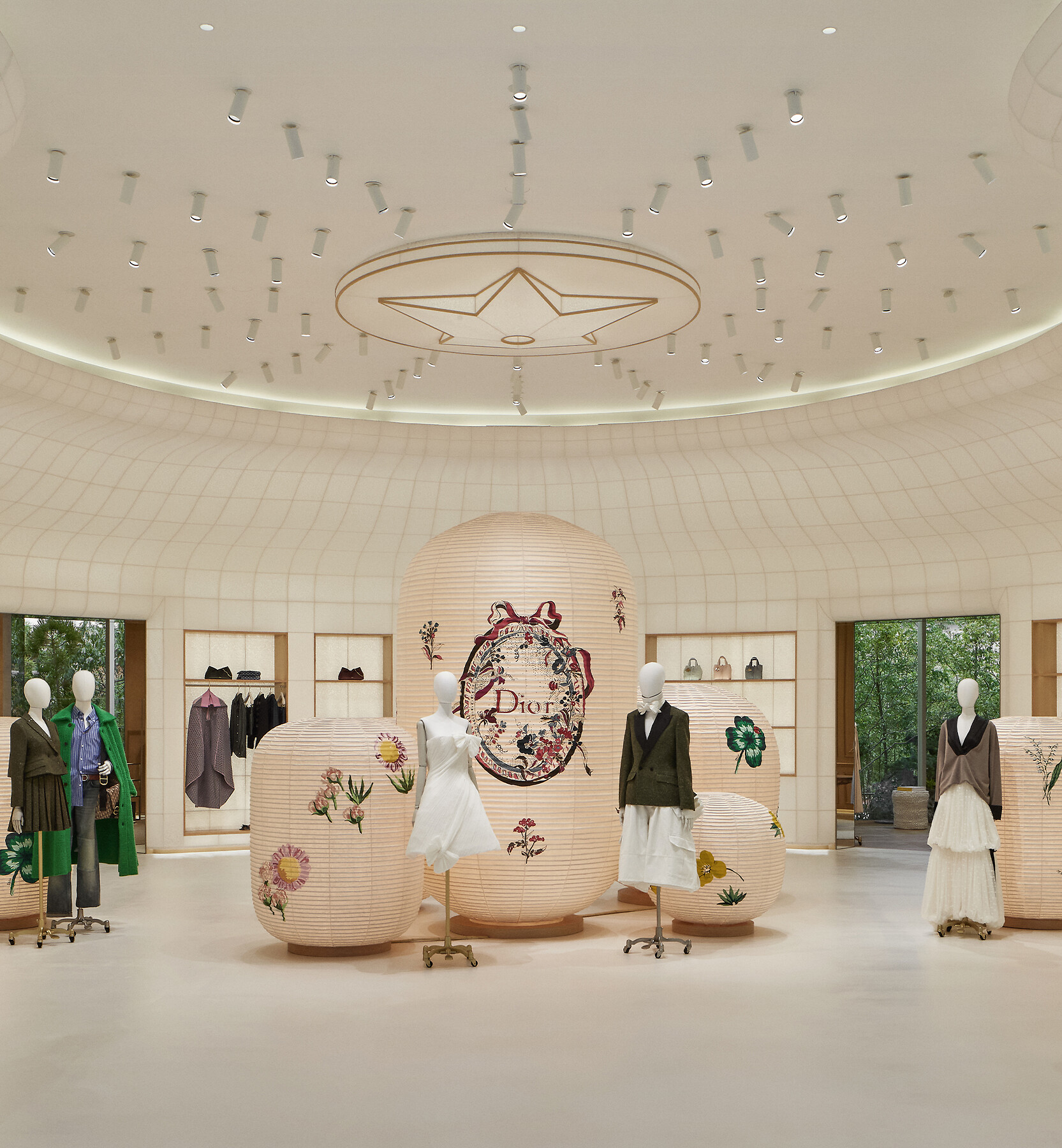 「バー」スーツから「ジュノン」ドレスに至るまで、メゾンを代表するフォルムが随所に反映され、ブティックという概念を超越した「ディオール バンブー パビリオン」は、メゾンの歴史への旅をご提案します。