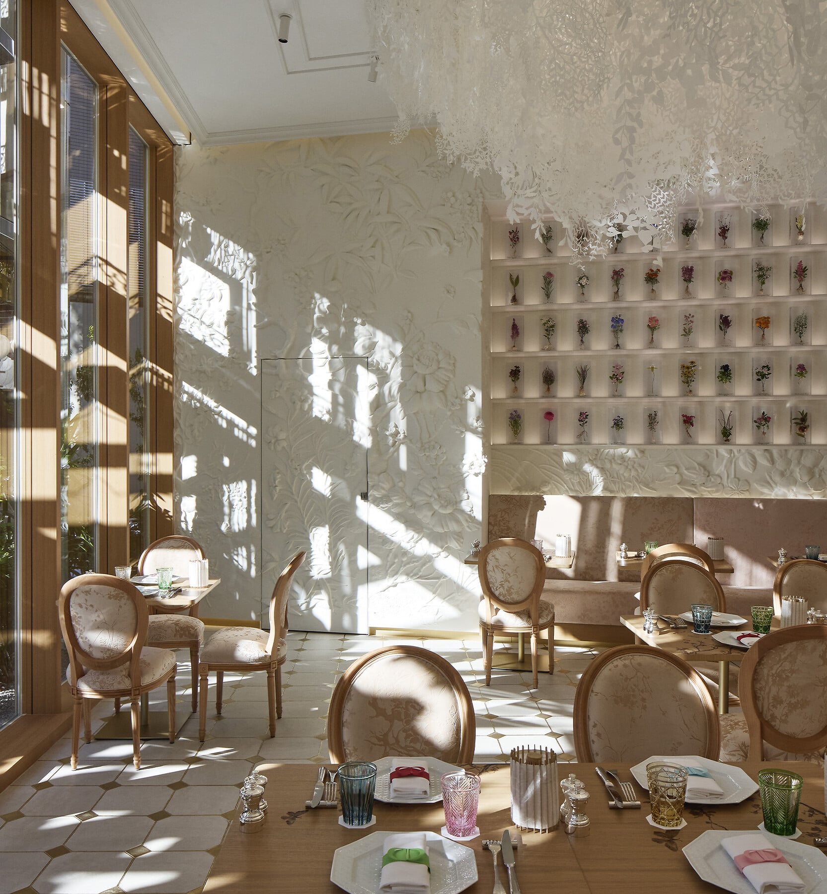 「カフェ ディオール」は、フランス料理と「アール ドゥ ヴィーヴル(暮らしの美学)」を披露し、アンヌ=ソフィー・ピックが考案したエクスクルーシブなメニューにより究極の驚きを提供します。このムッシュ ディオールの情熱へのオマージュは、カプセルに覆われた数多くの花々によって表現されています。