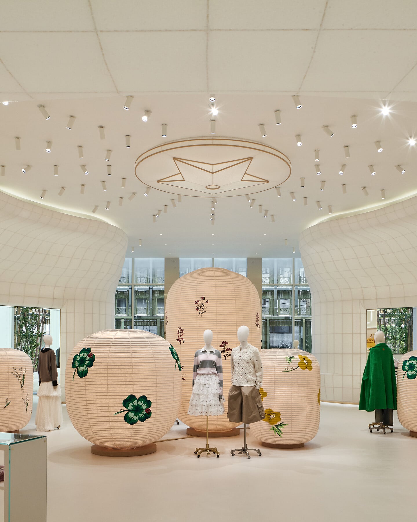 提灯はメゾンの伝説である「レディ ディオール」バッグの形をしています。TAKT PROJECTや太田翔、柴田あゆみ、we+、光井花、CHIKAKENといった現代デザイナーたちの作品が、パビリオン全体に繊細なアクセントを加えています。