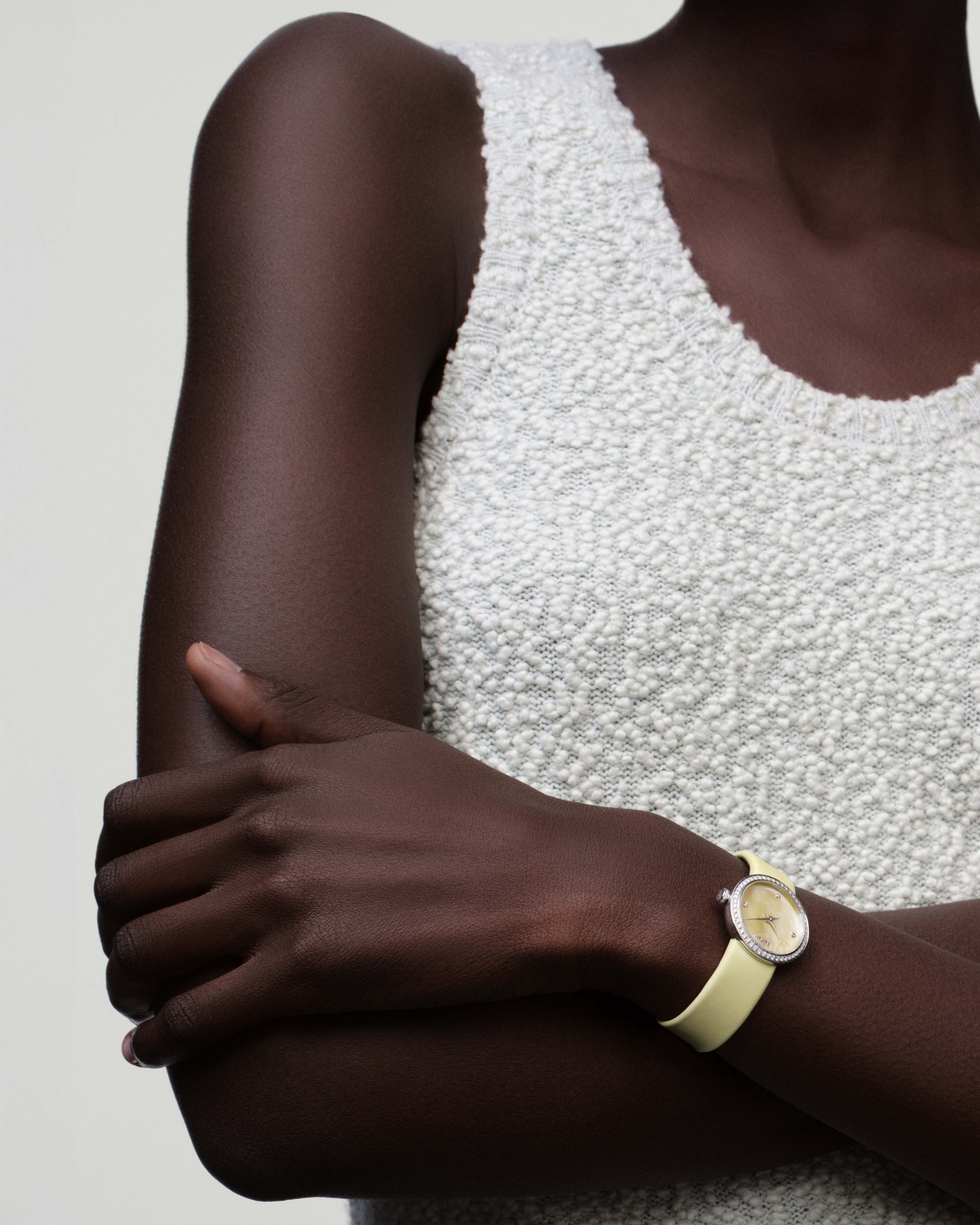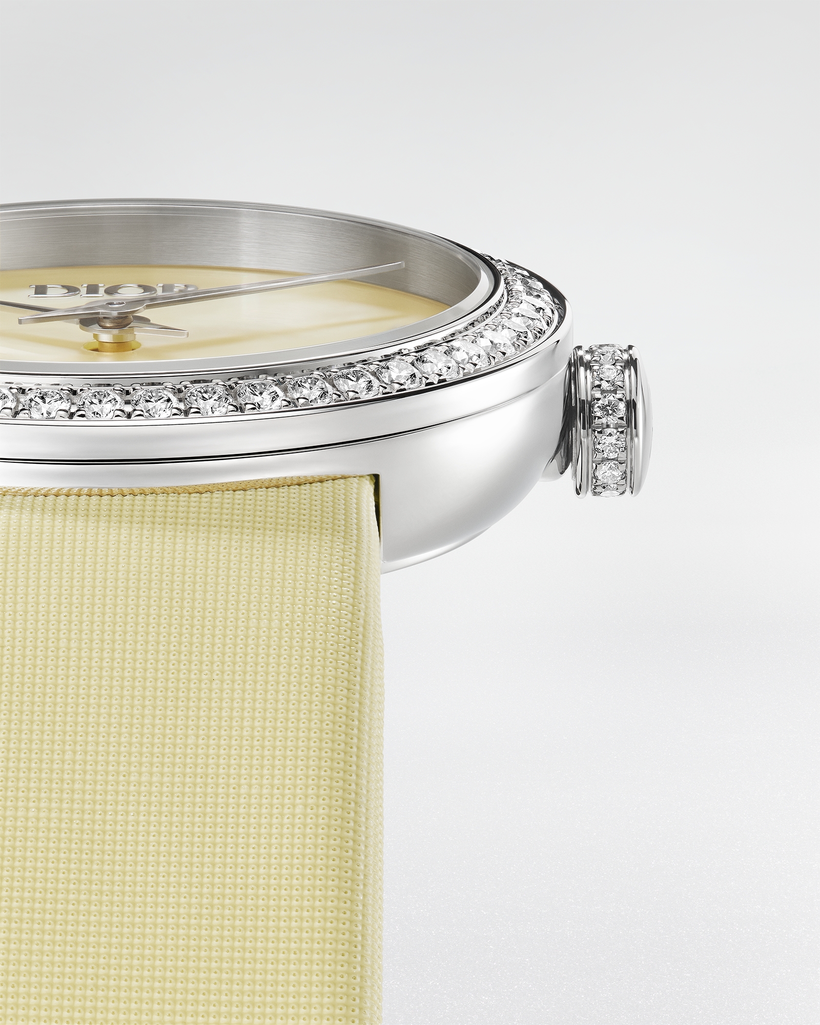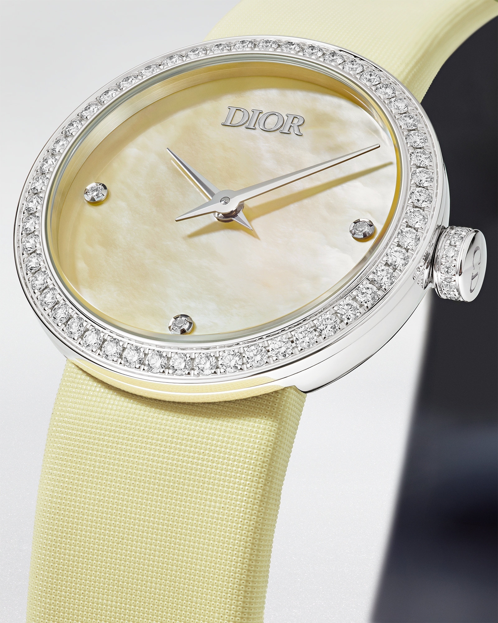 ブリリアントカット ダイヤモンドのインデックス3個 (0.02カラット*) をセッティングしたイエロー マザーオブパールの文字盤