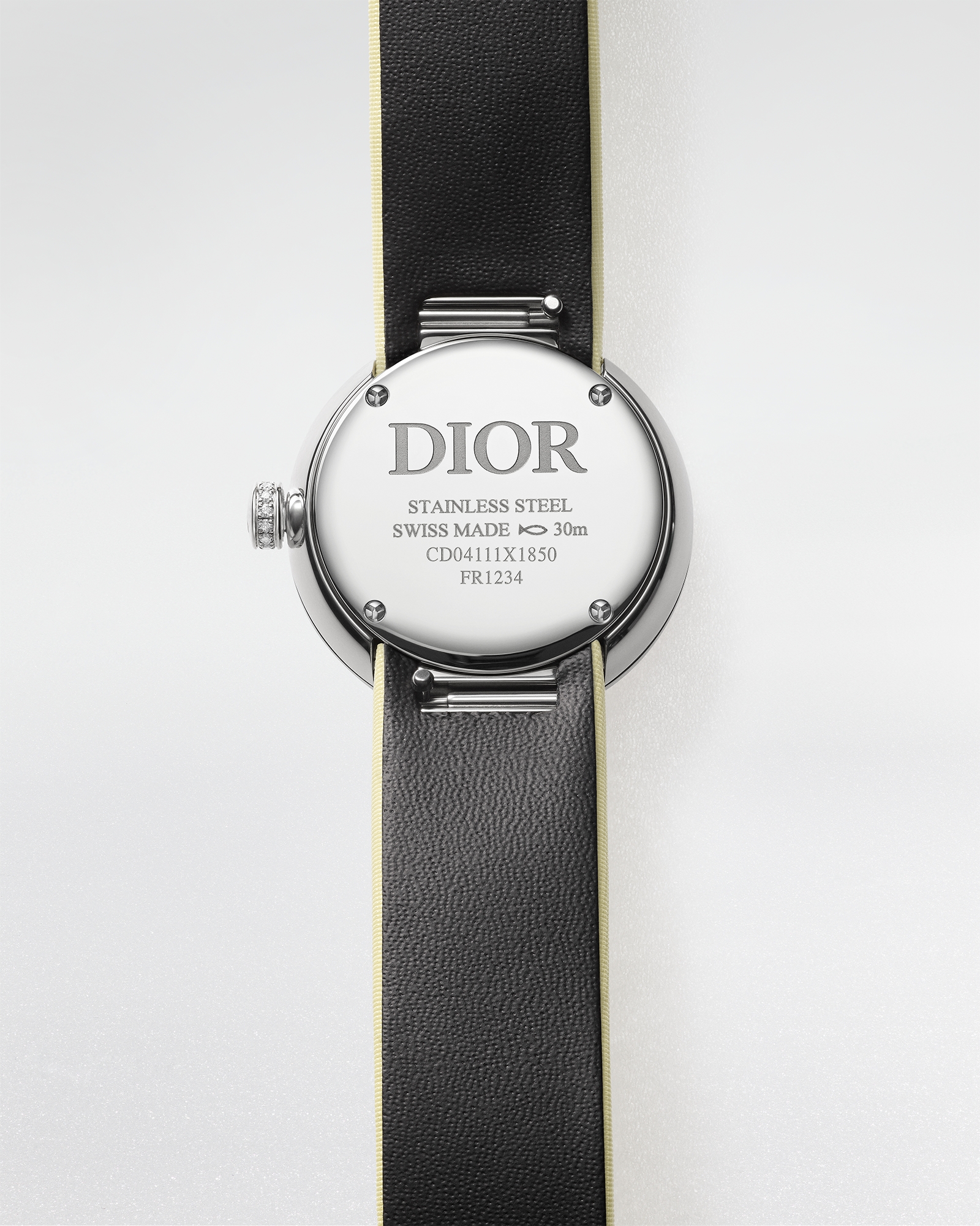 CD刻印を施し、ブリリアントカット ダイヤモンド13個 (0.03カラット*) をセッティングしたスチール製リューズ