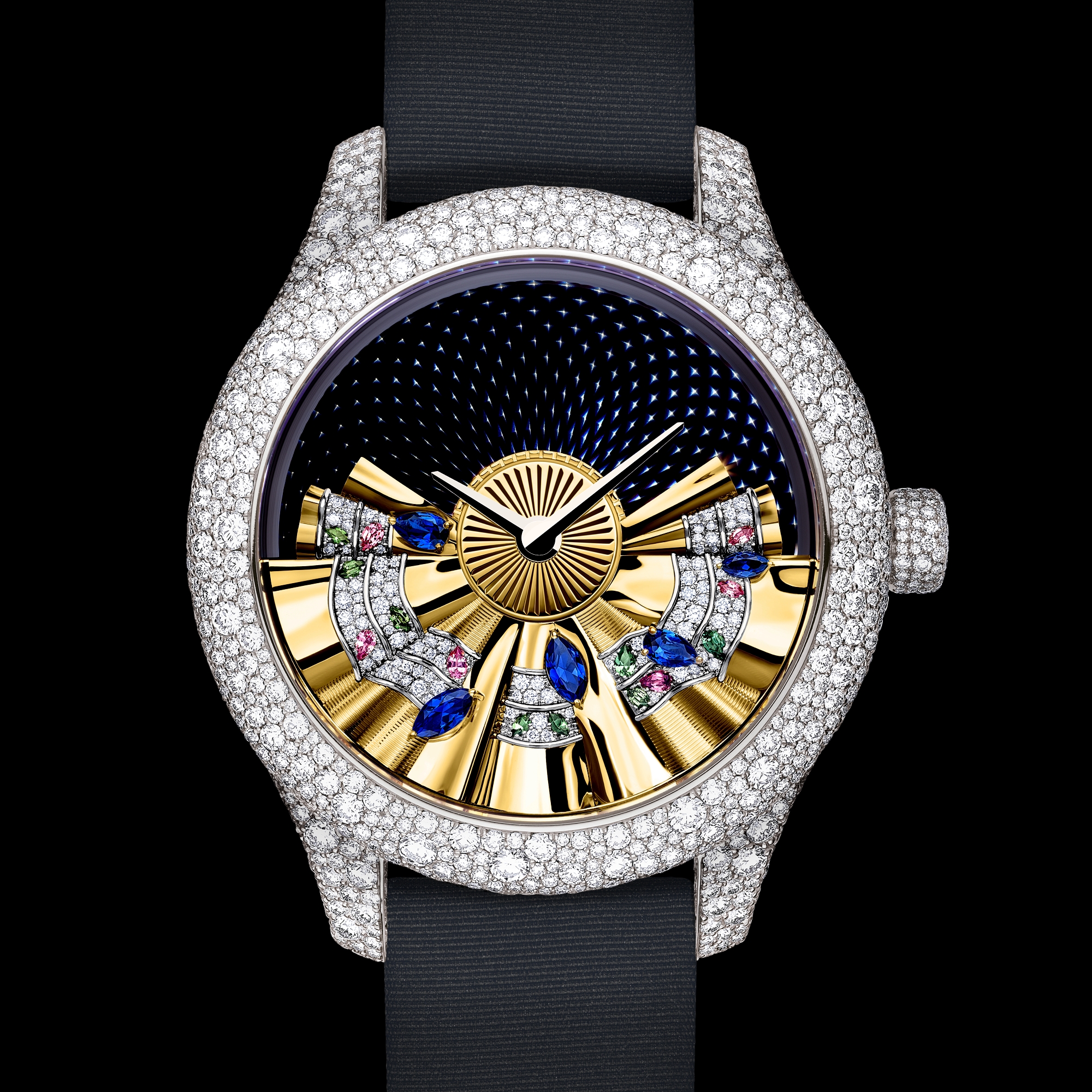ブラックタフタ ストラップ、ブリリアントカット パヴェ ダイヤモンドをセッティングしたホワイトゴールド製ピンバックル付き。