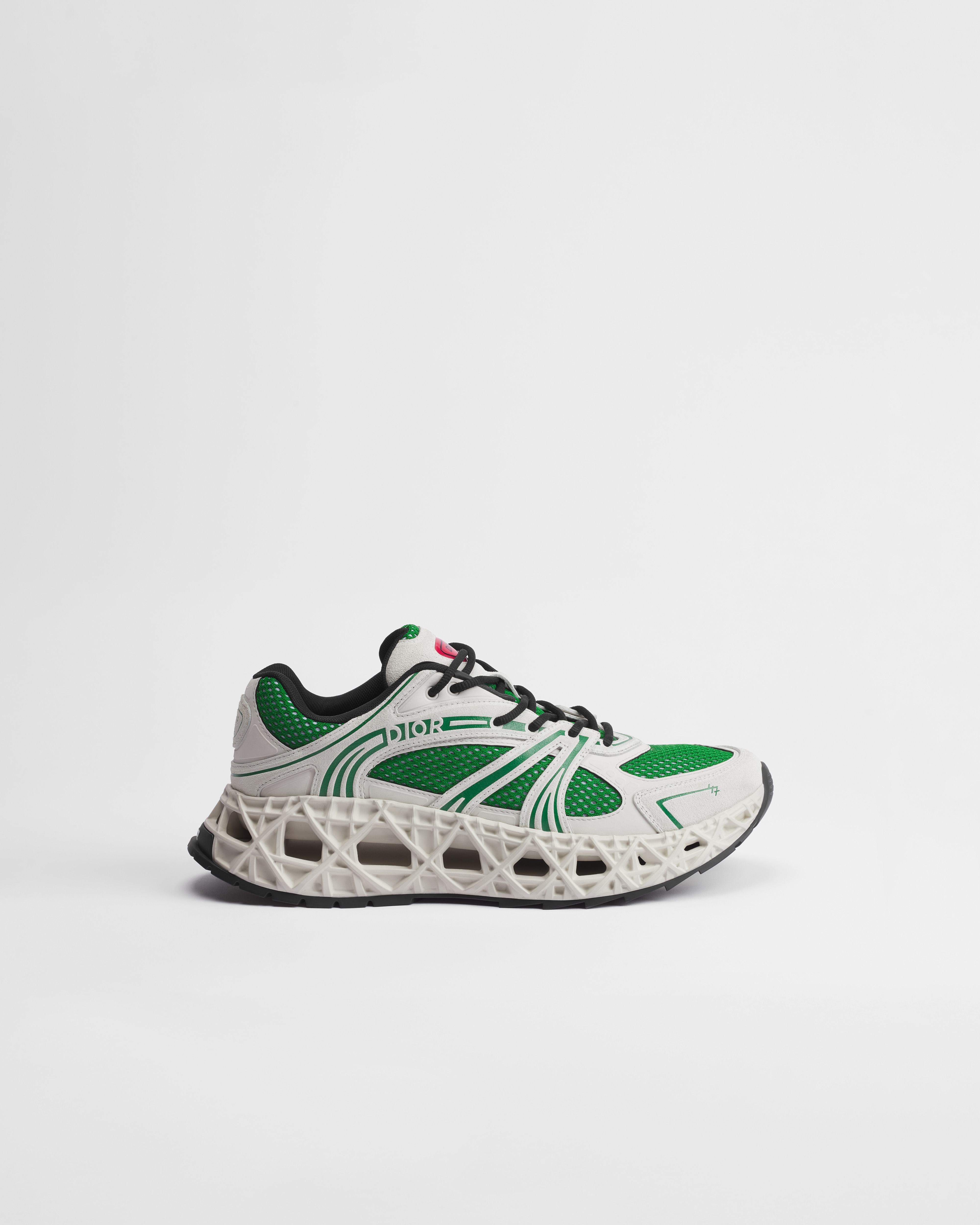 •  화이트 스웨이드 카프스킨, 화이트 테크니컬 패브릭 & 그린 테크니컬 메시