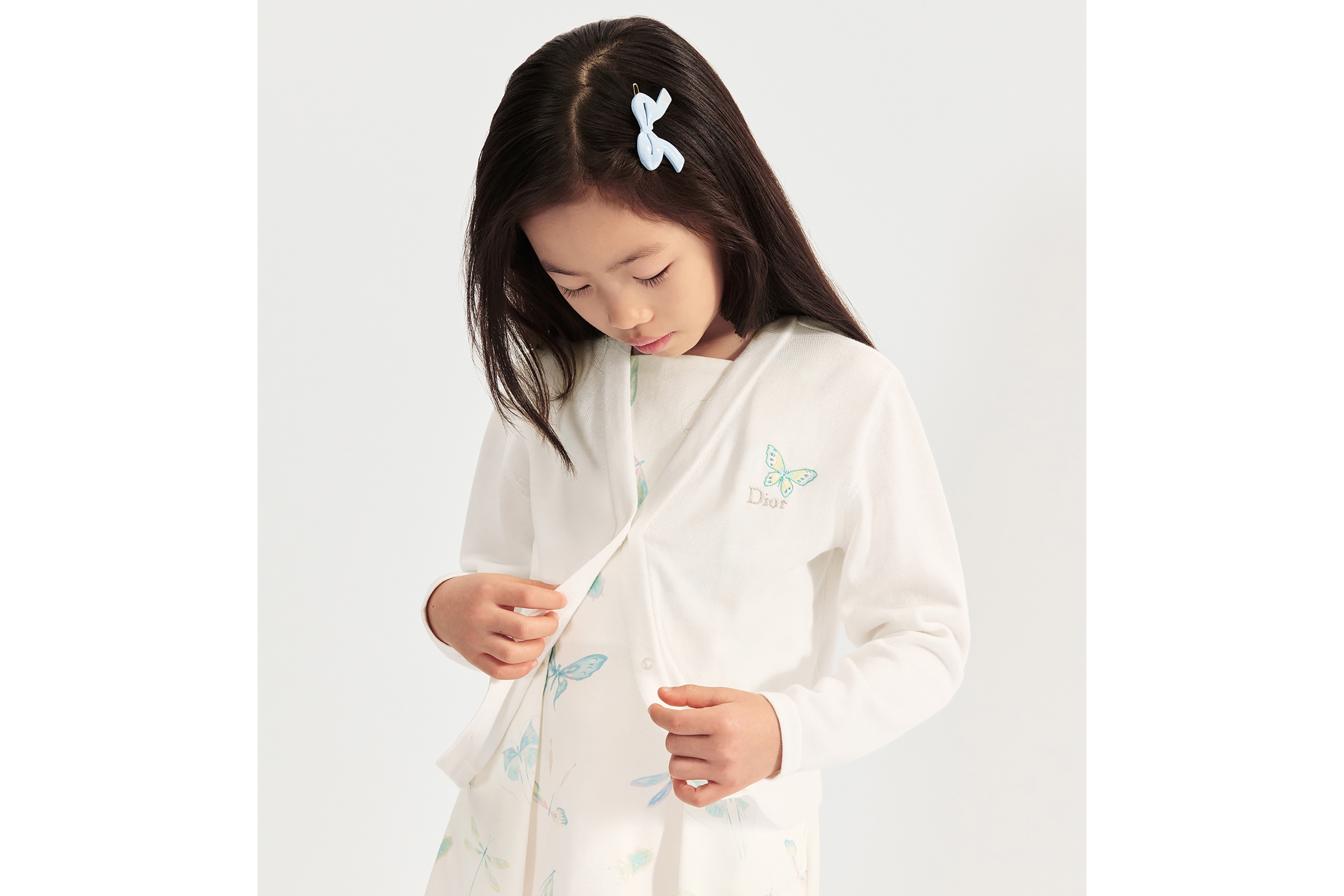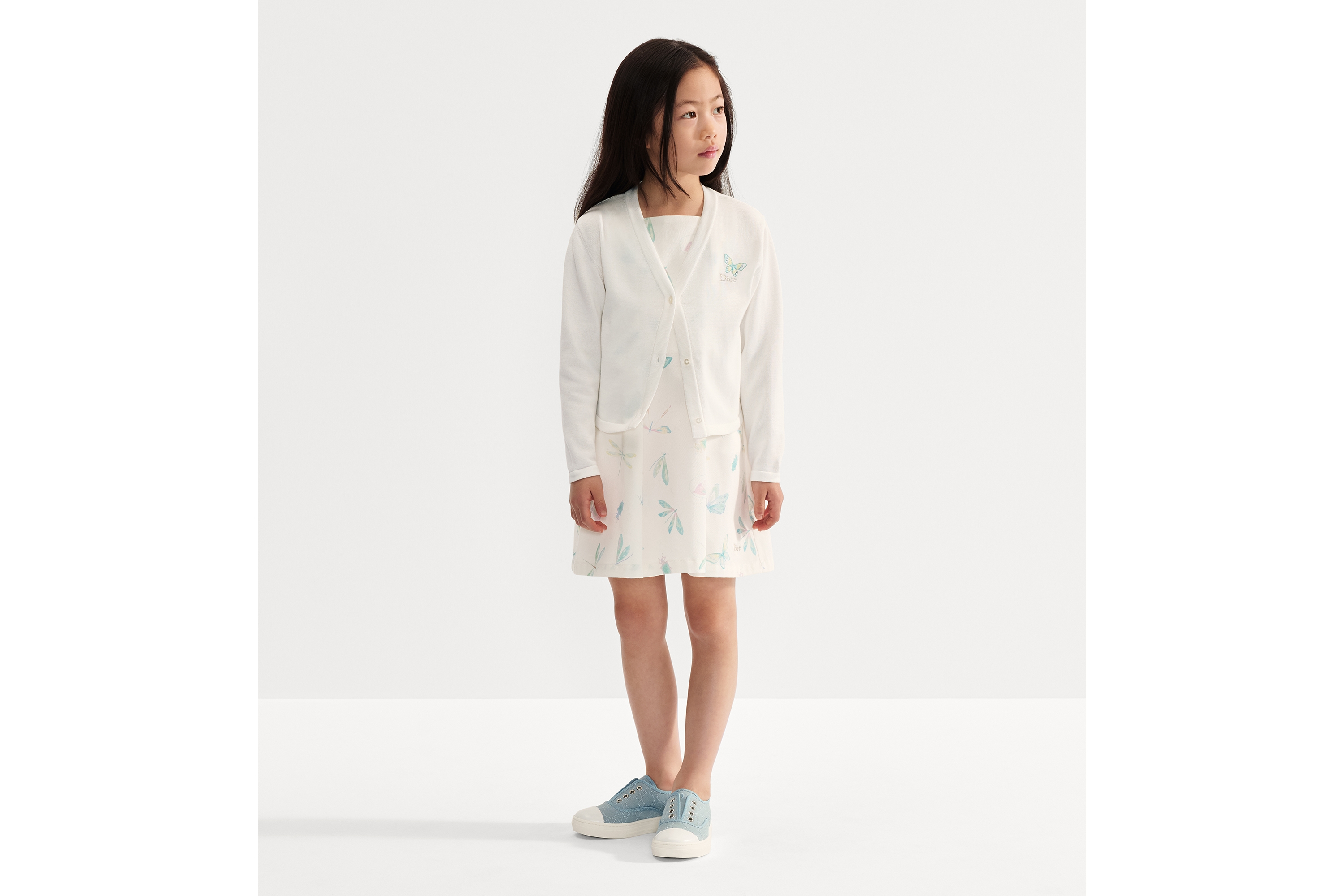 Het meisje is 123 cm lang en draagt maat 6