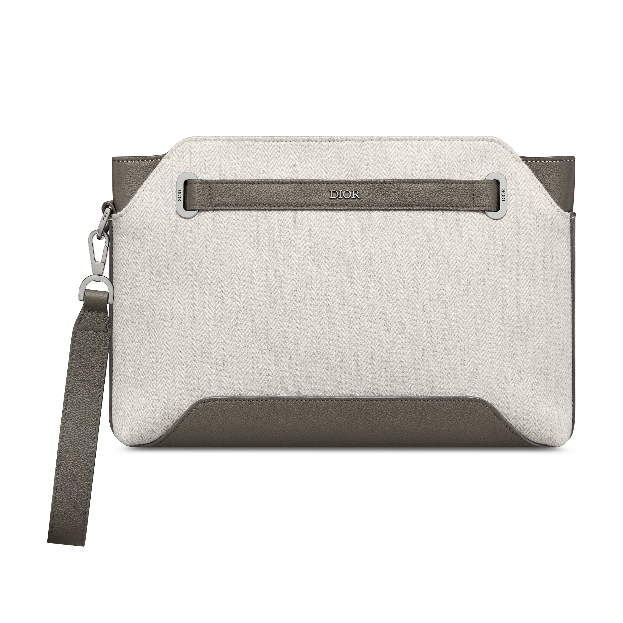 Novidade da coleção Inverno 2025, a clutch pochette triangular A5 Dior Normandie é um novo item essencial da Maison. Uma expressão do virtuosismo dos ateliês da Dior, o modelo é confeccionado em algodão cinza com padrão chevron e couro de vitelo Dior Icons cinza. A peça tem ilhoses com a inscrição Dior Normandie e uma alça de couro Dior. Detalhes minuciosos, como a composição gráfica nas laterais, valorizam seu estilo refinado, enquanto o compartimento espaçoso é acompanhado por um bolso aberto oculto na parte da frente. A alça de pulso removível em couro de vitelo granulado permite que a clutch pochette seja usada na mão ou guardada dentro de uma bolsa.