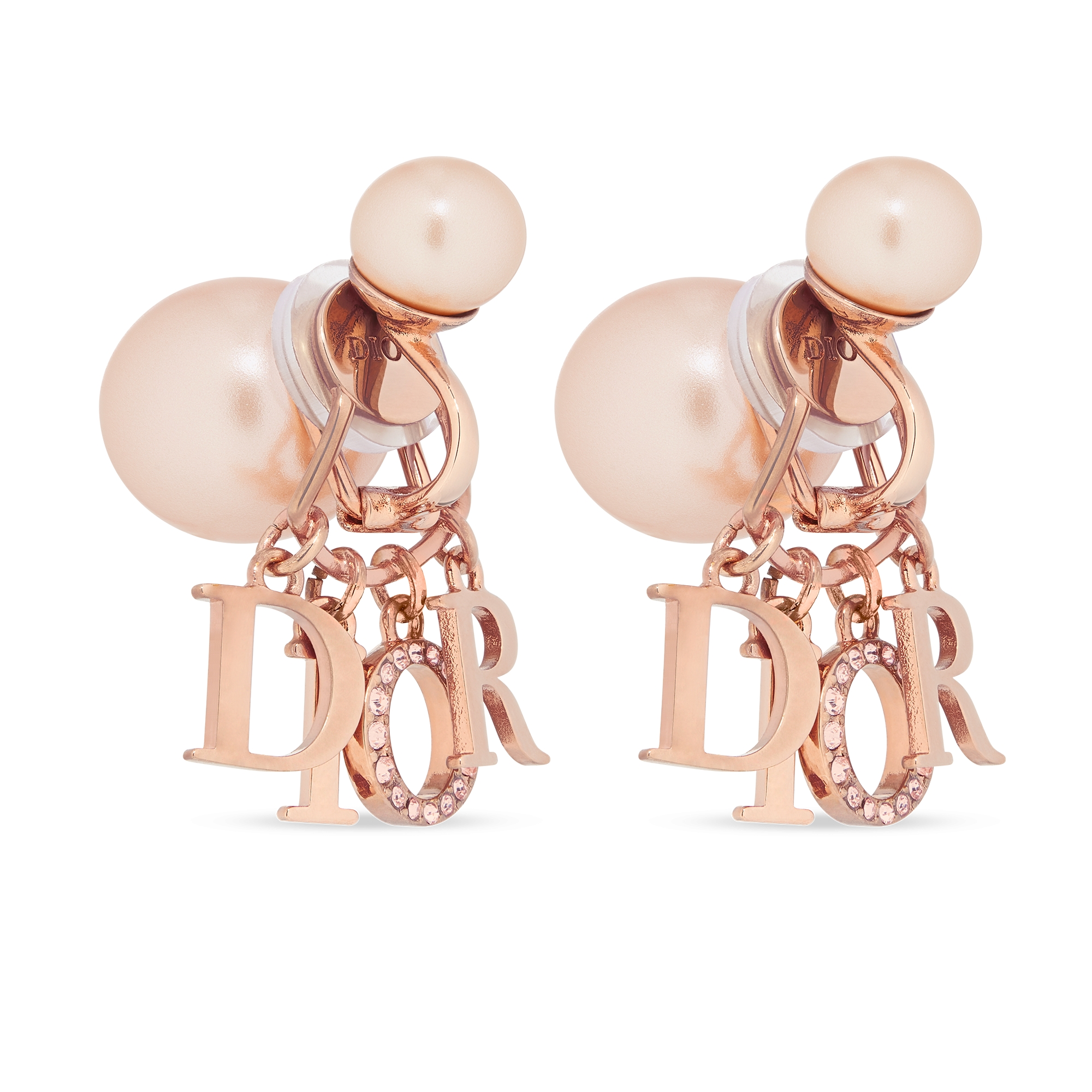 Nesta estação, o visual icônico dos brincos Dior Tribales é recriado em uma versão de pressão. As pérolas de resina rosa são valorizadas pelas letras D.I.O.R. em metal com acabamento rosa, com a letra O cravejada com cristais rosa. Estes brincos de pressão ousados podem ser combinados com criações da linha Dio(r)evolution.