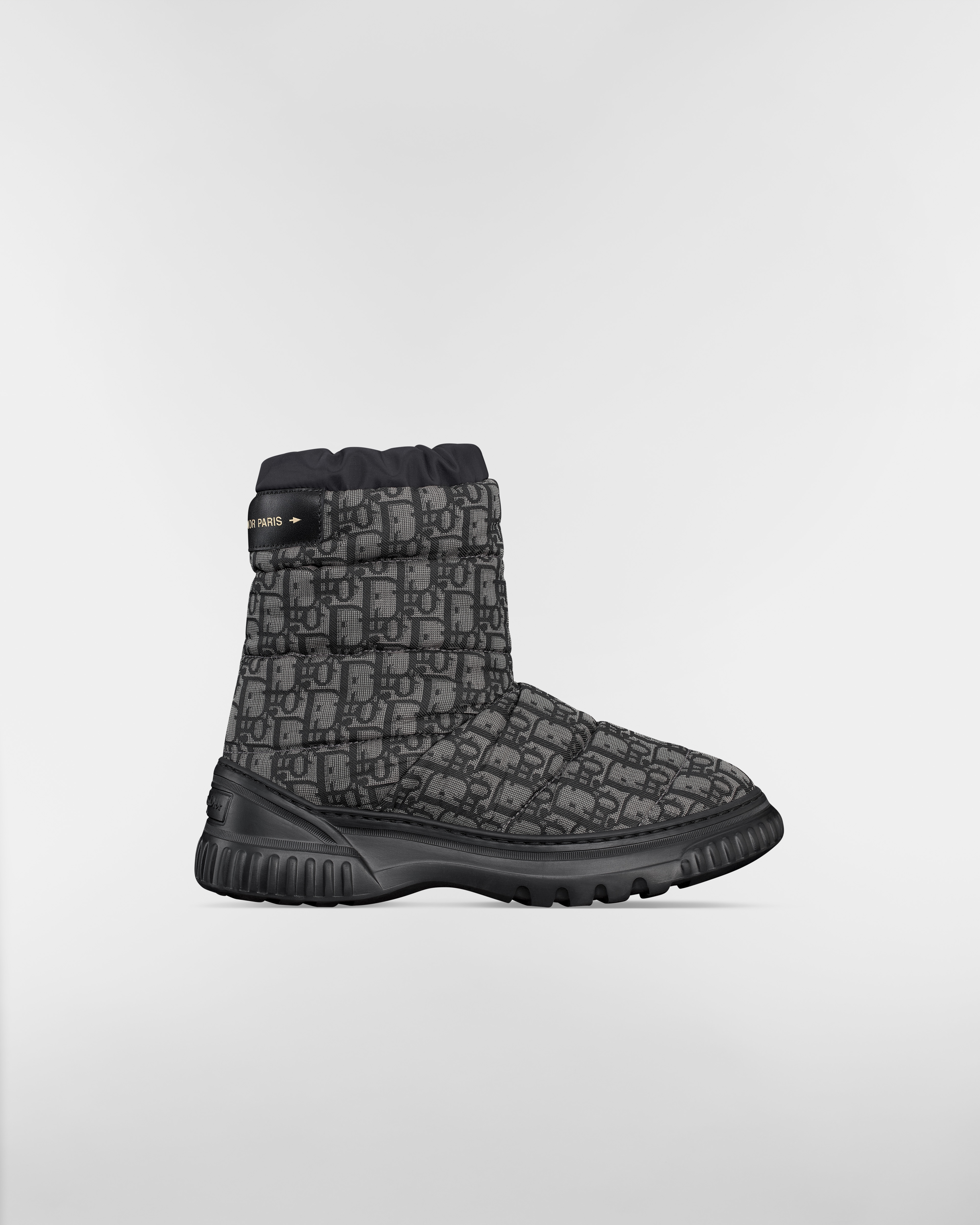 Parte da coleção cápsula DiorAlps, a ankle boot Dior Frost recria um modelo après-ski em uma versão elegante. O cabedal em nylon acolchoado Dior Oblique cinza-escuro e preto é complementado pelo interior com efeito de pelo de cordeiro branco e um elástico para um ajuste perfeito. Uma etiqueta em couro no mesmo tom com uma inscrição Christian Dior Paris dourada valoriza a parte de trás, enquanto a sola com logotipo de borracha ultraleve finaliza o calçado. Ela pode ser combinada com outras criações DiorAlps.