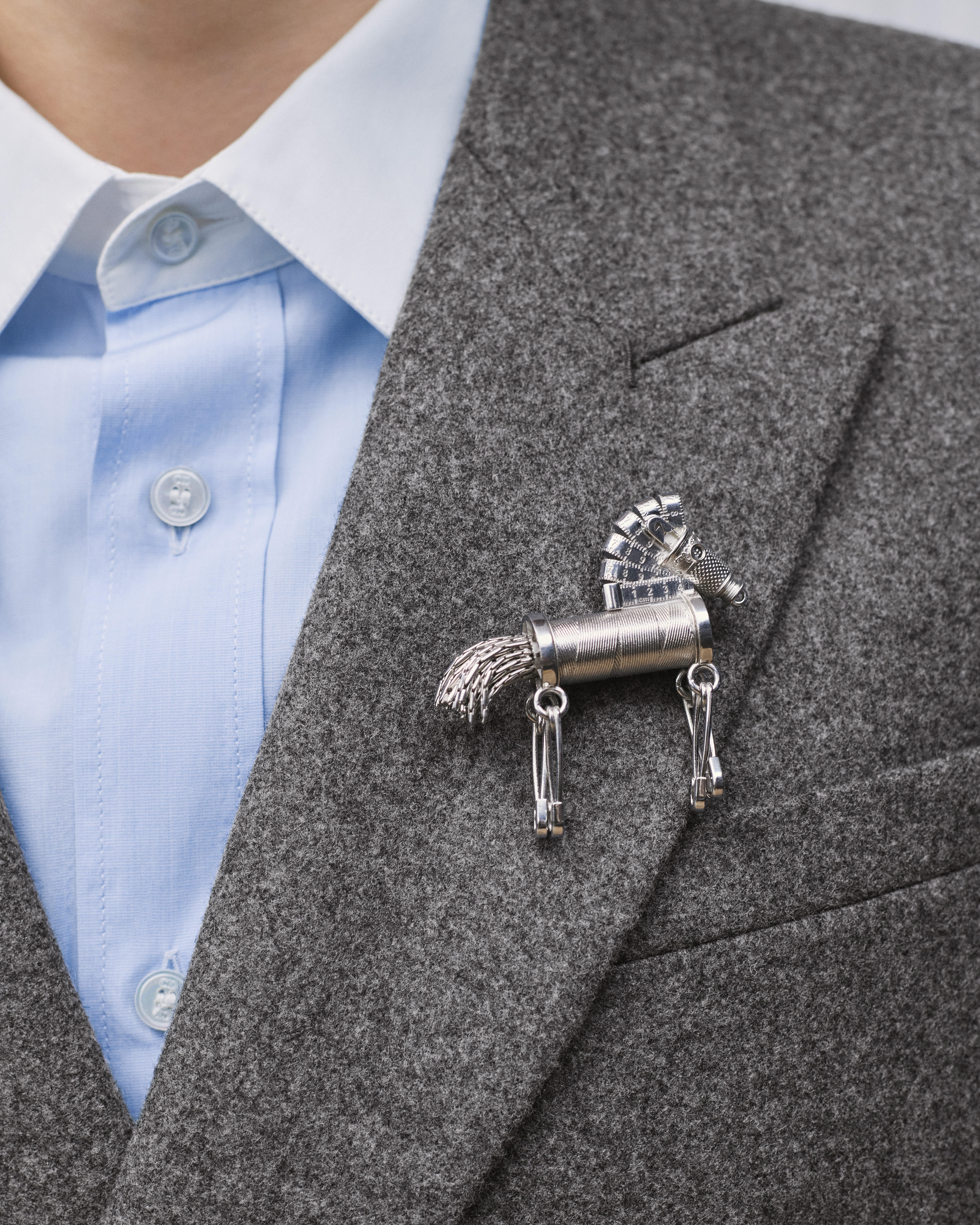 Parte da coleção de estreia de Jonathan Anderson para a Maison, o broche Dior Couture Charms incorpora um espírito lúdico enquanto celebra os icônicos códigos de estilo da Dior. Confeccionado em prata, o acessório exibe um cavalo articulado com características emblemáticas do universo do ateliê. O broche pode ser combinado com outras criações Dior Couture Charms da coleção.