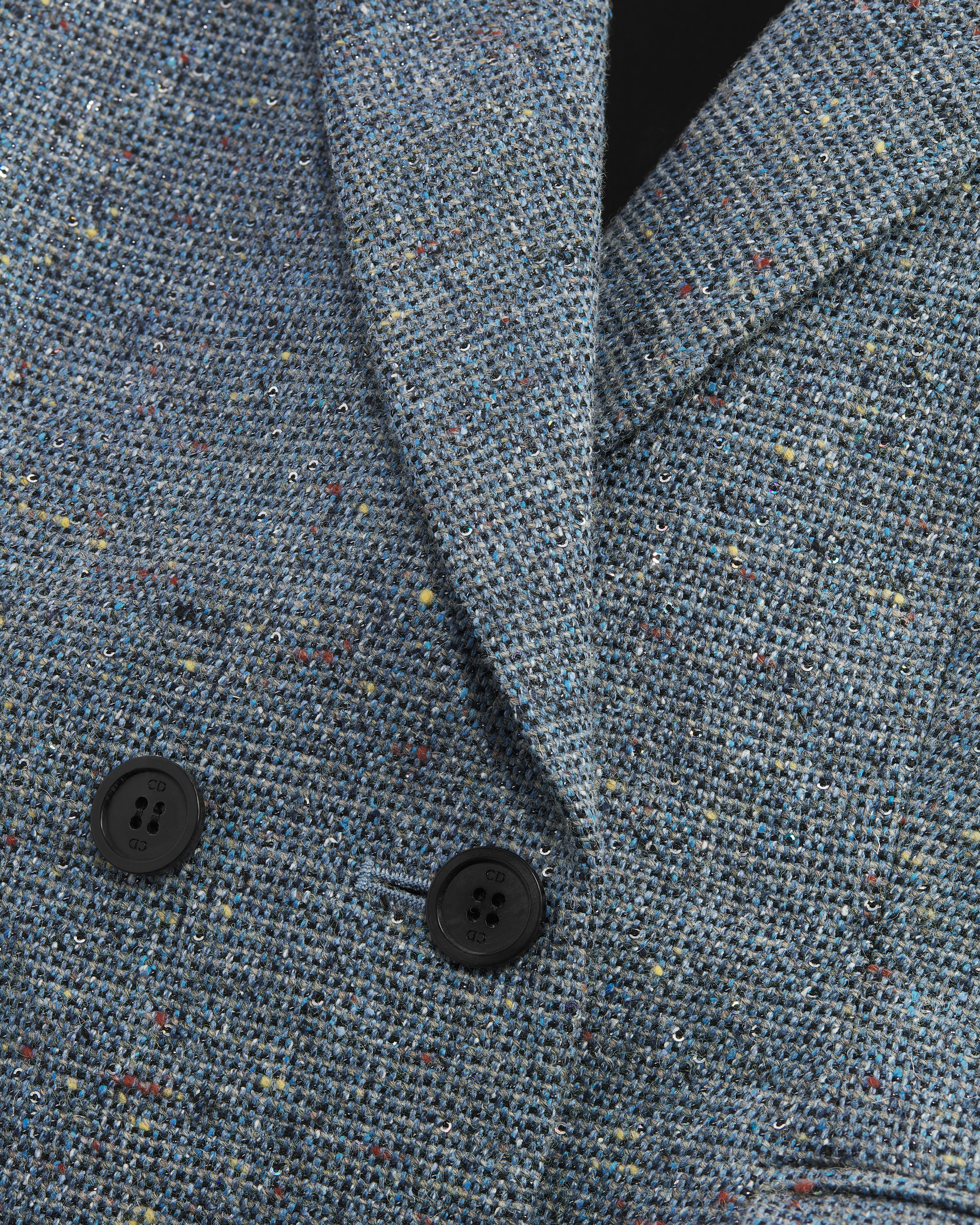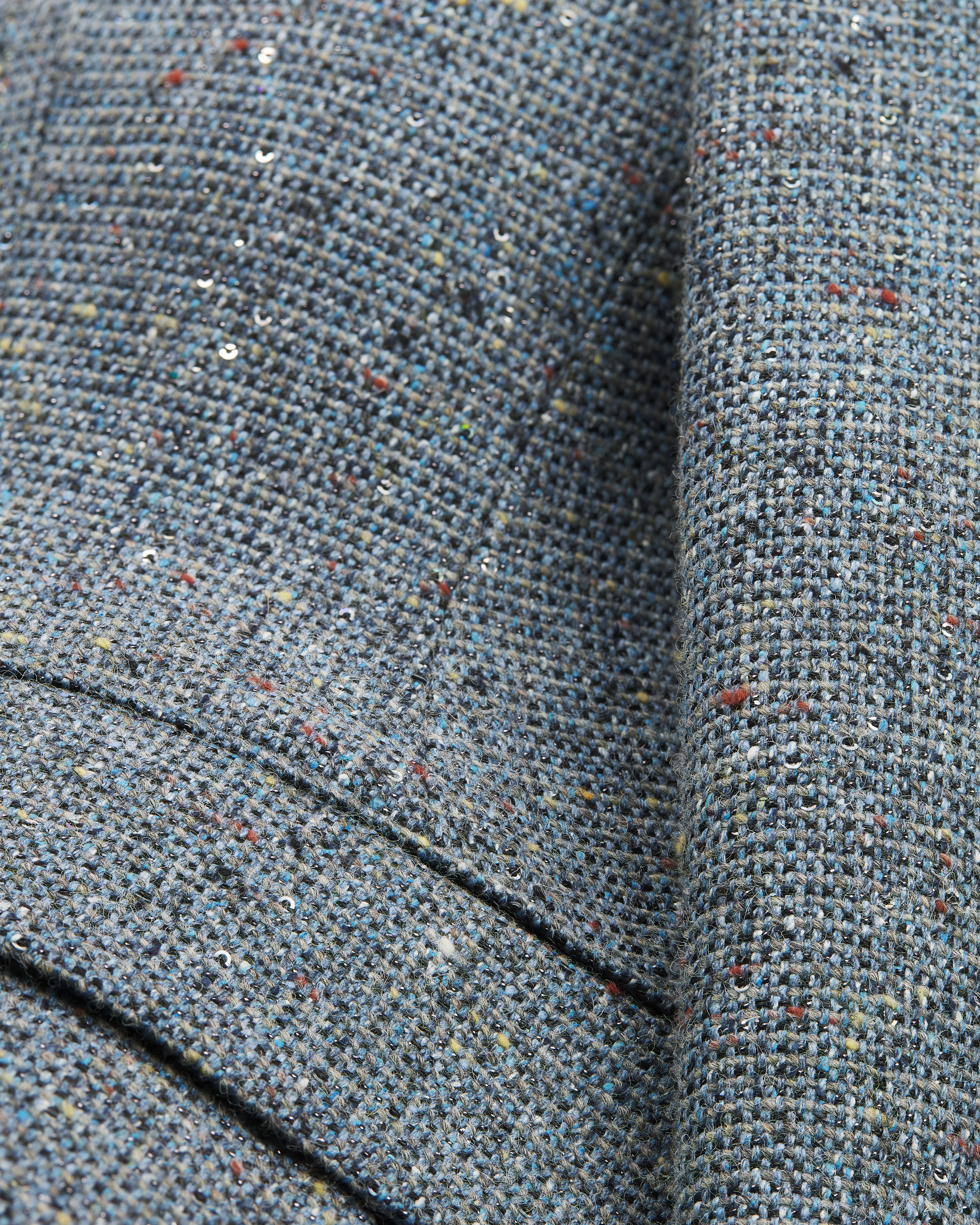 ผ้าทวีดผสมผ้าไหมและผ้าวูลเวอร์จินสีน้ำเงิน ปักประดับด้วยเลื่อมหลากสี