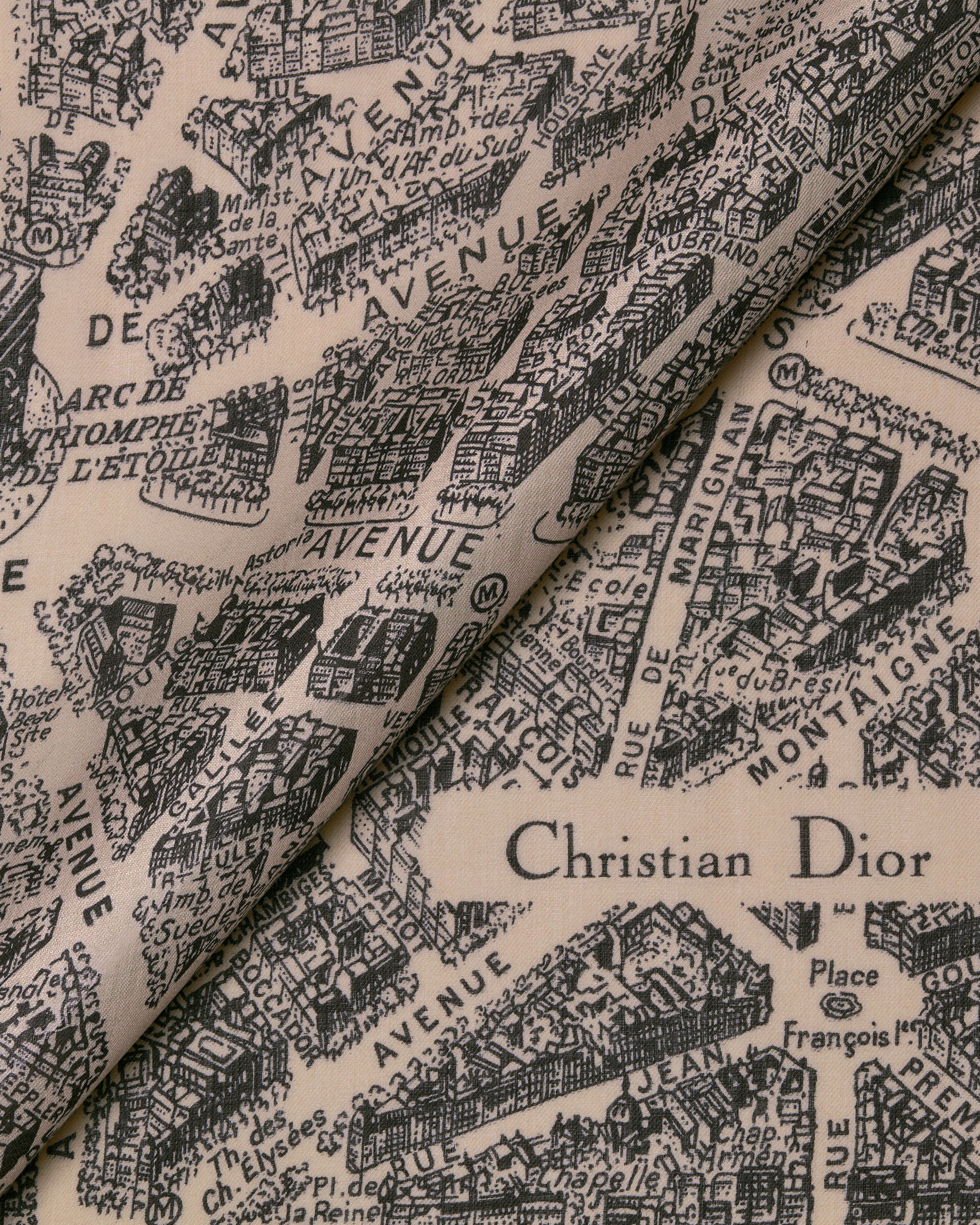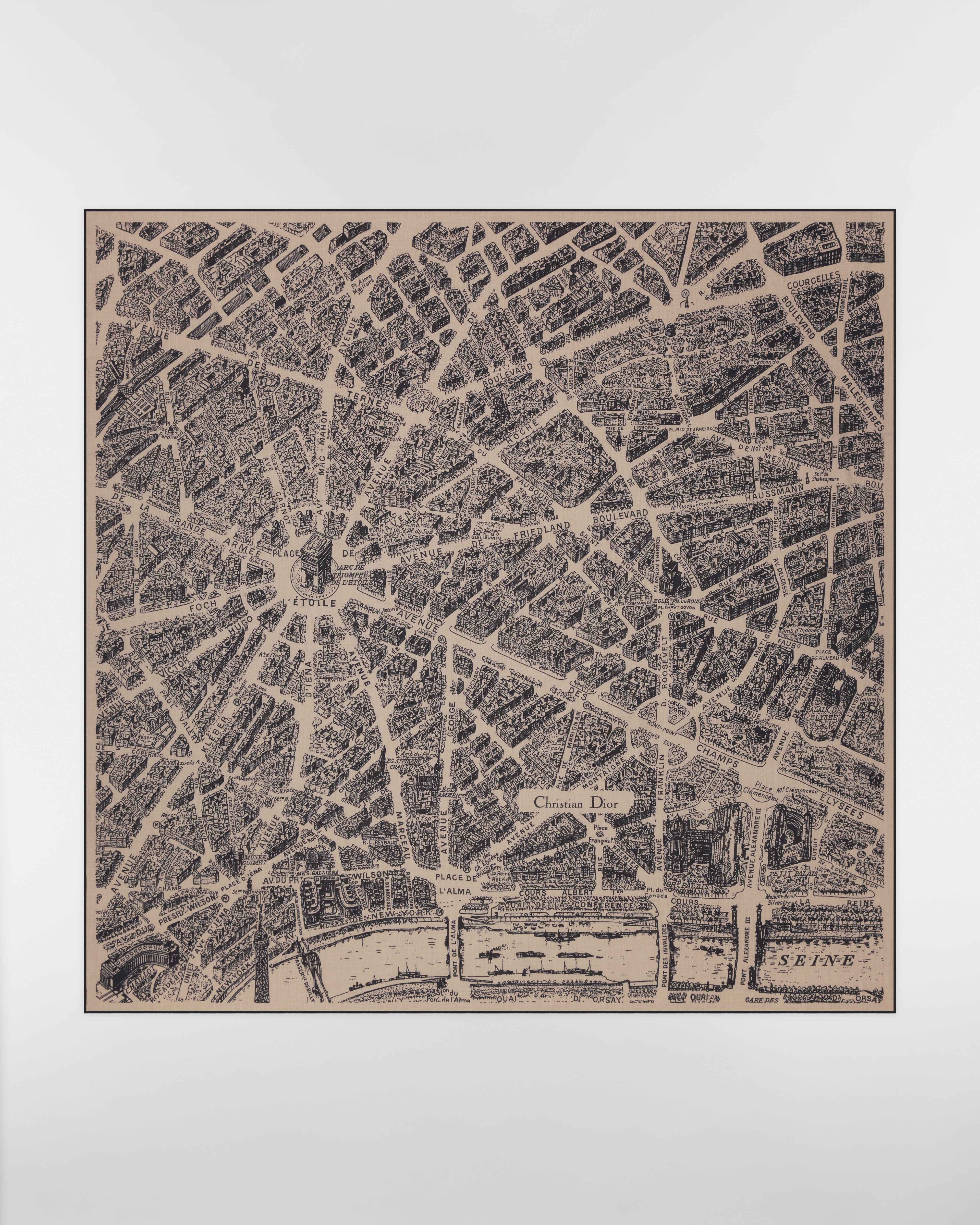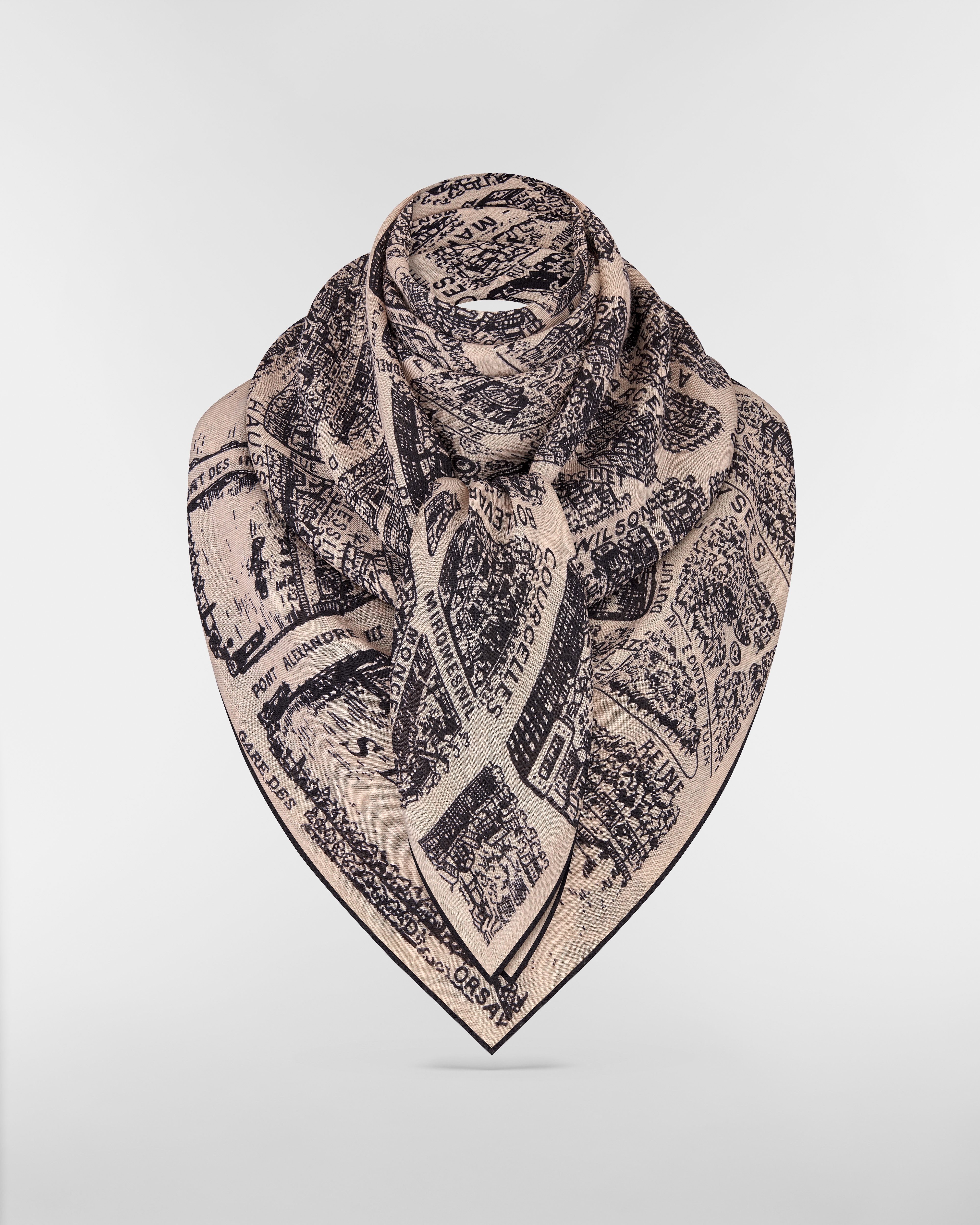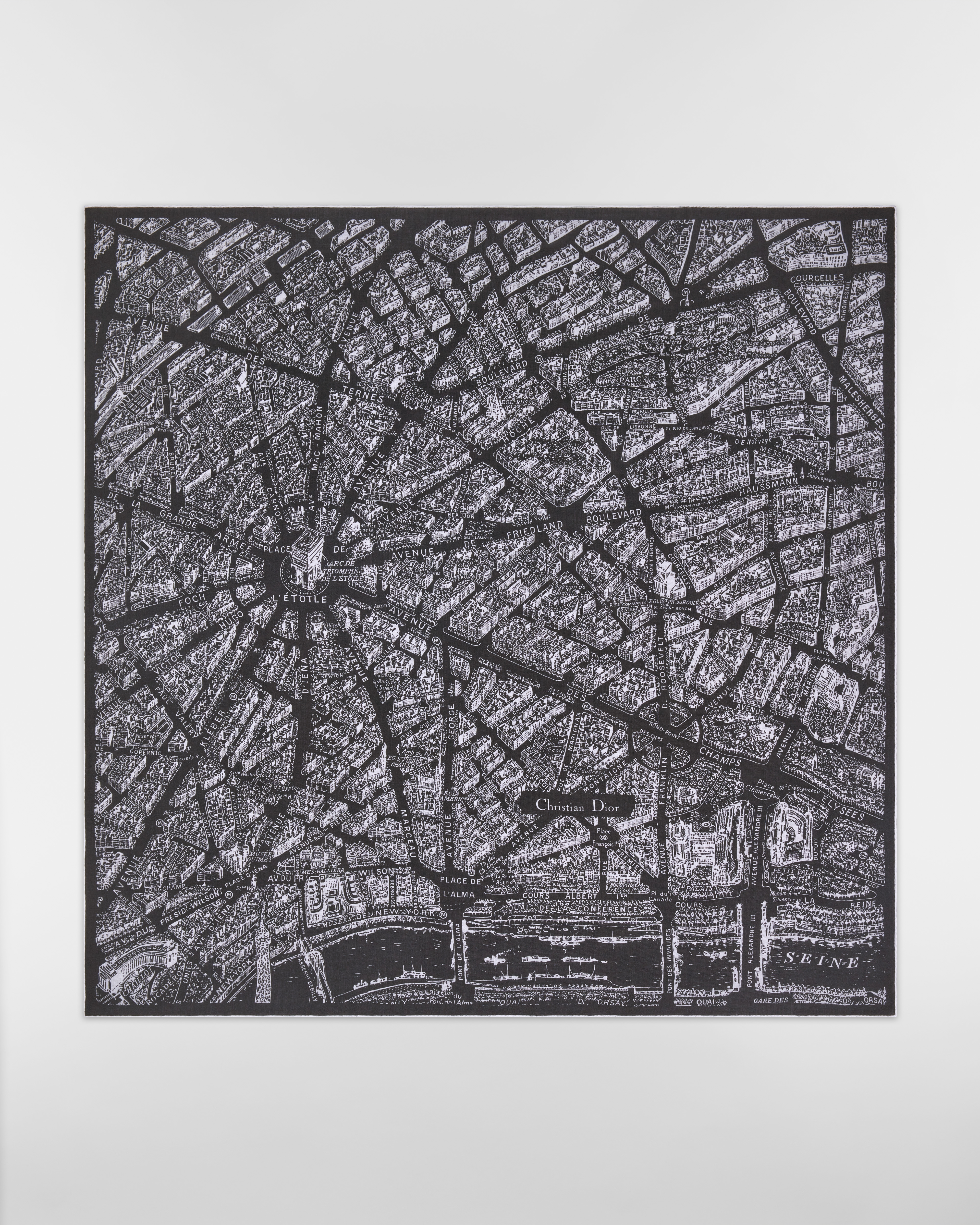這款披肩飾有經典 Plan de Paris 圖案,其靈感來自 Dior 典藏作品,並以 Dior 歷史悠久的蒙田大道地標為設計核心。作品以米色和黑色喀什米爾羊絨製作,搭配手工捲邊和 Christian Dior 標誌。款式柔軟輕盈,可繫於頸間或披掛在肩上。