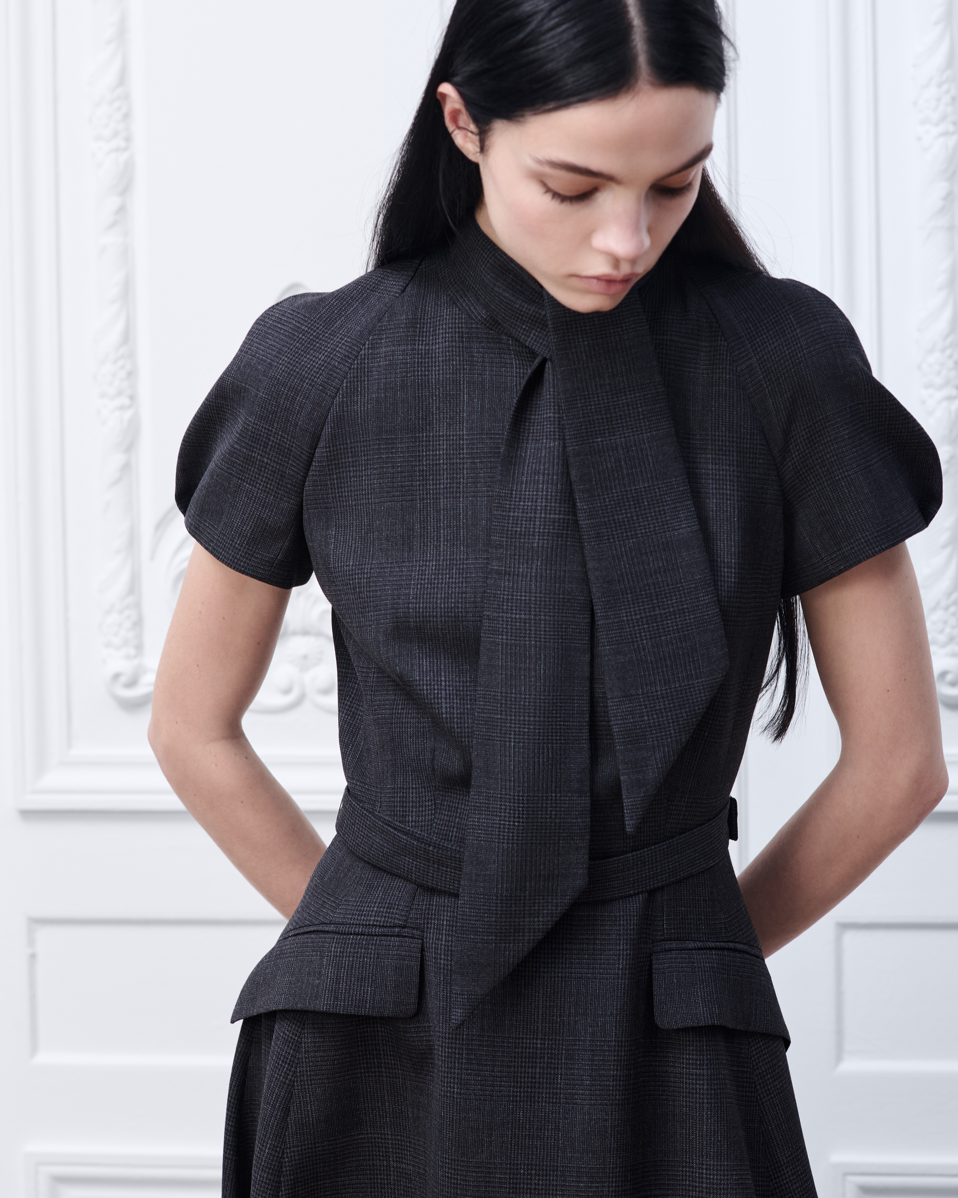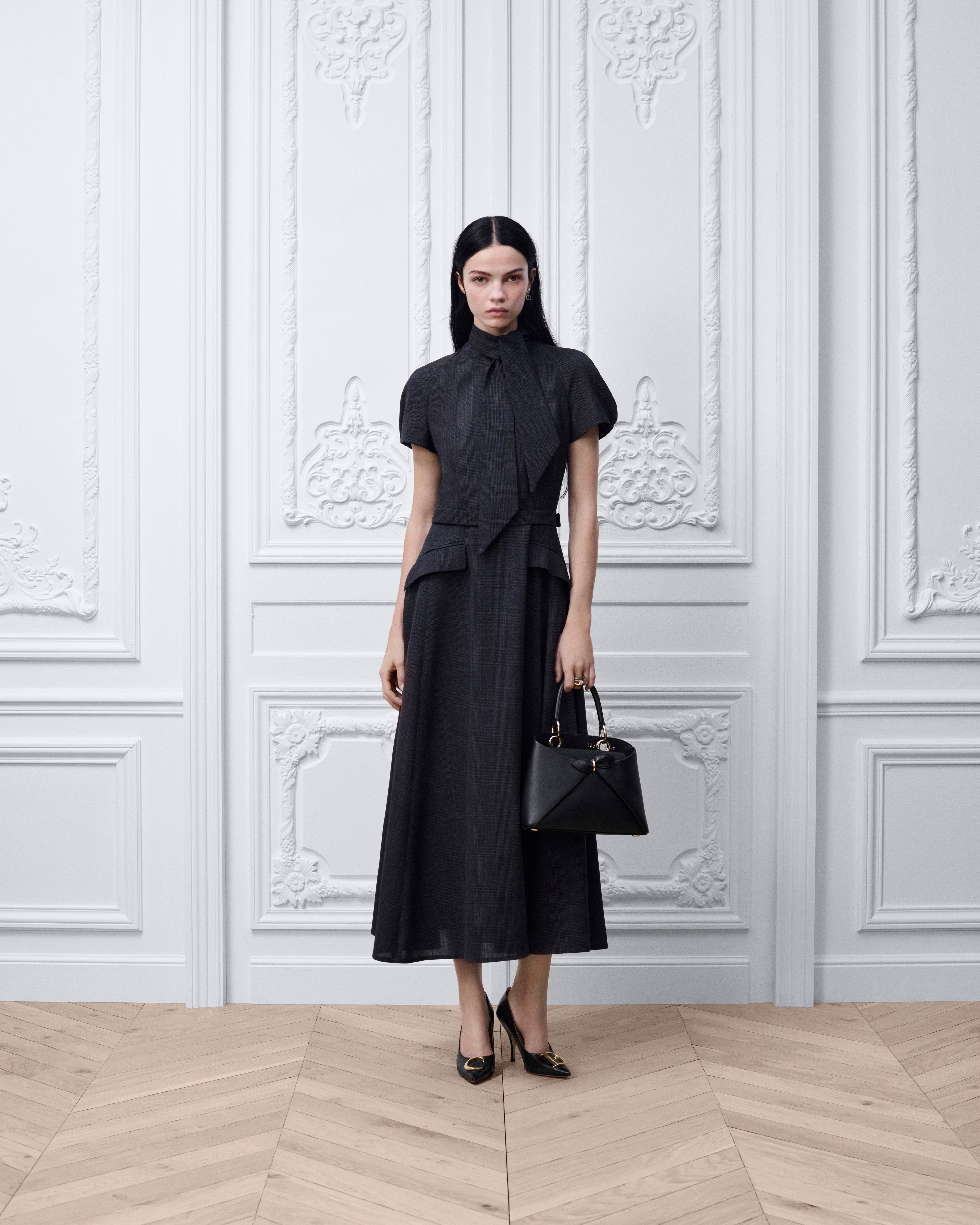 寬領帶效果繫帶領口中長洋裝