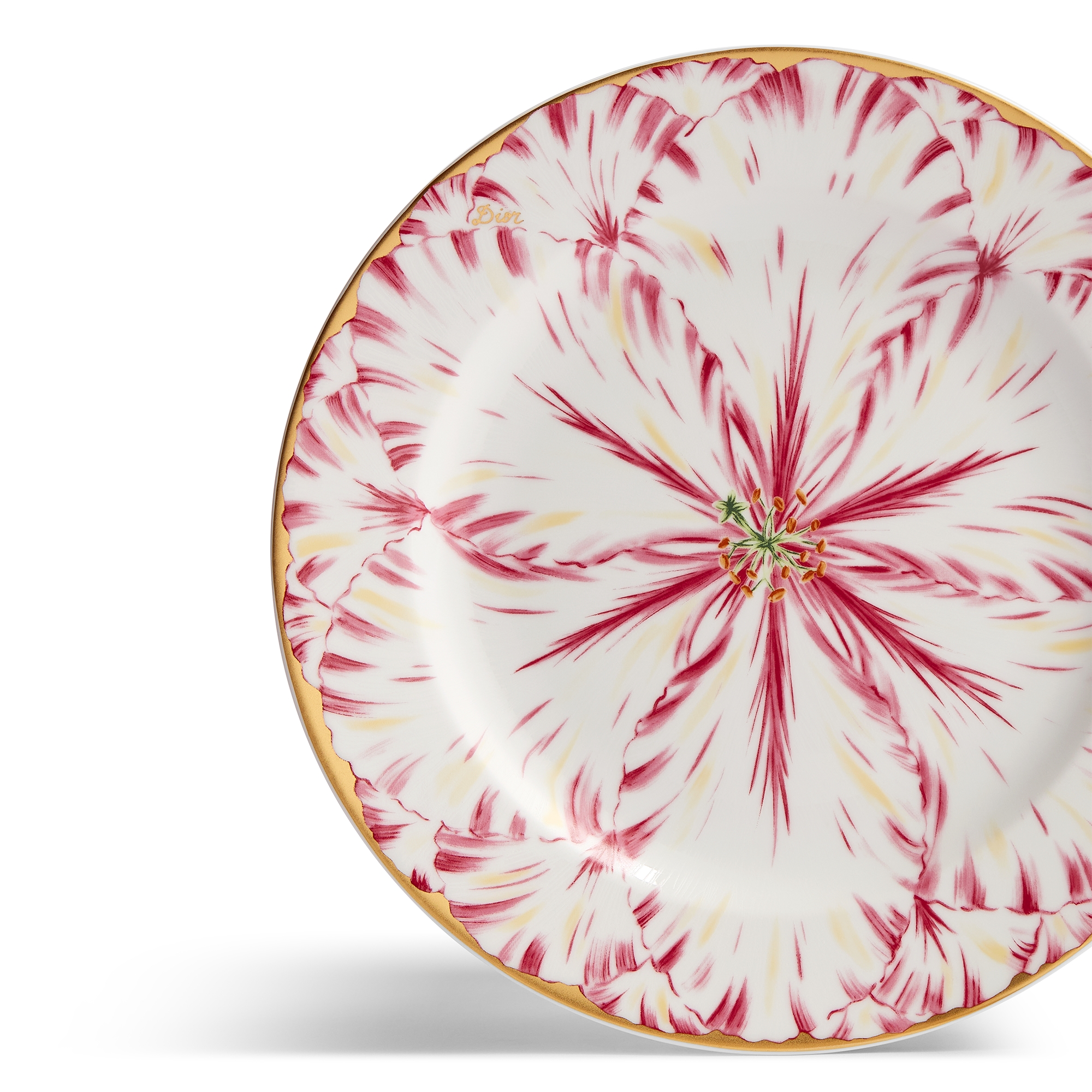 這款甜點盤是 Champs de Tulipes 系列的作品之一,向 Mr. Dior 設計的 Tulipe 系列和嬌嫩的鬱金香致敬,象徵愛與新生。作品以 Limoges 陶瓷製作,點綴 24K 黃金和優雅的粉紅色花瓣,展現唯美的詩意,能為餐桌增添一抹光彩,並可與同系列的其他作品相互搭配,譜寫一曲獻給生活藝術與待客之道的花卉頌歌。